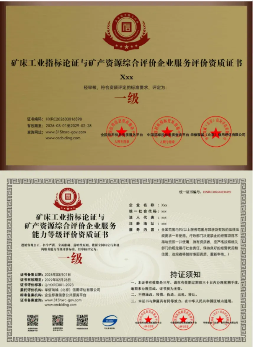 备注:同一单位报名3人(含3人)送【矿床工业指标论证与矿产资源综合评价企业服务能力等级评价资质证书】文末看企业证书与牌匾
