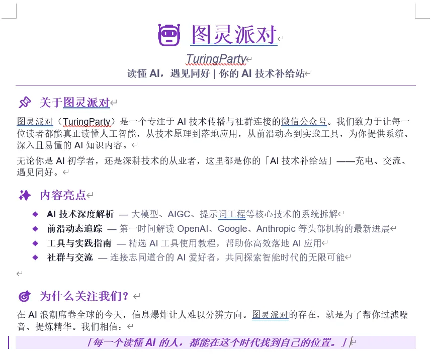 这是Claude给我导出的word文档,可以看到很好的follow了模版的格式,包括字体颜色和图标也是完全复刻。