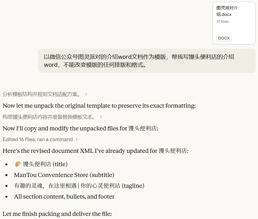 然后,让Claude参考这个模版介绍另外一个微信公众号,Claude发现这是一个和word处理相关的任务,于是就调用了对应的docx skill来进行处理。
