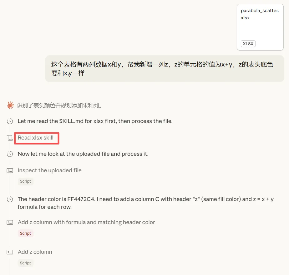 我这里让Claude给我新增一列z,且z的单元格数值为x+y。这里也是开始调用了excel处理对应的xlsx skill。