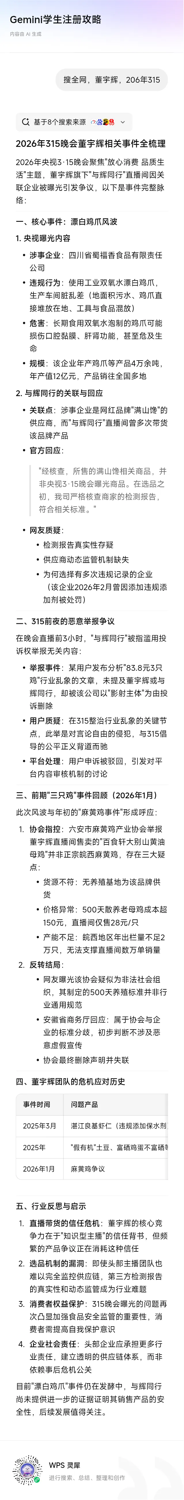 多源信息自动汇总:比如直接搜索“董宇辉,2026年315”,AI 会自动联网搜索十来个网页源,直接给出提炼后的信息。