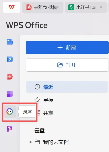 先召唤灵犀:点击首页【左边侧面板】,找到【WPS 灵犀】。