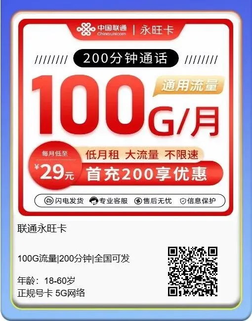 02 可发全国:联通永旺卡【29元100G+200分钟】
