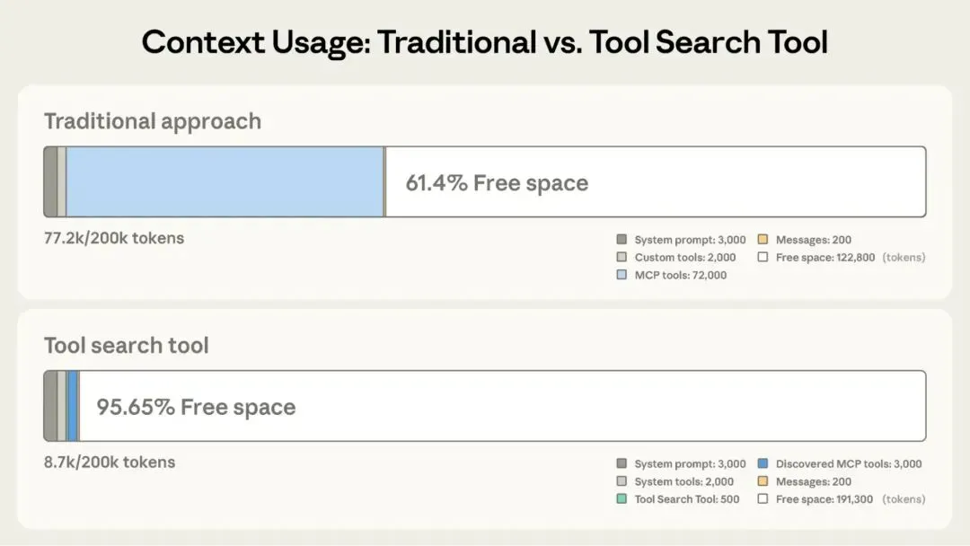 Tool Search Tool 不是预先加载所有工具定义,而是按需发现工具。Claude 只看到它当前任务实际需要的工具。