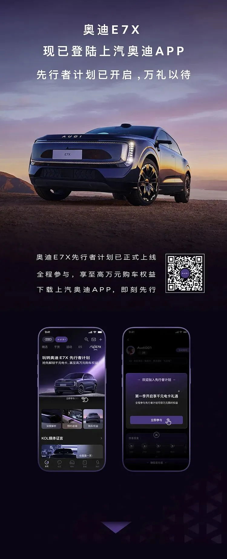 奥迪E7X现已登陆上汽奥迪APP,万元先行者计划开启 · *文章转载自 上汽奥迪 公众号 选择大众汽车金融中国 极速审批更快捷 定制化产品方案 一站式服务体验 更有海量零利率优惠供您选择 *详情请垂询当地经销商。 点击“阅读原文”