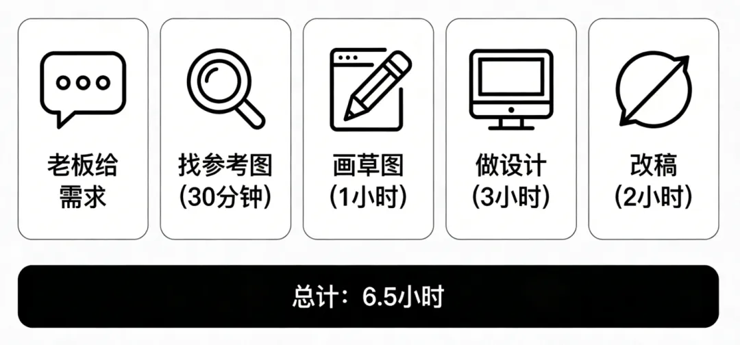 之前的工作流:老板给需求 → 2. 找参考图(30分钟)→ 3. 画草图(1小时)→ 4. 做设计(3小时)→ 5. 改稿(2小时)总计:6.5小时