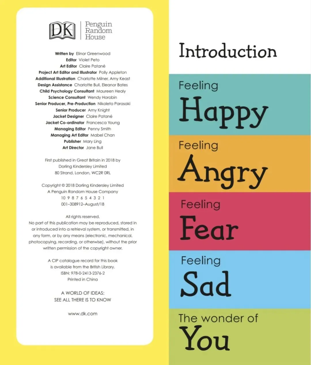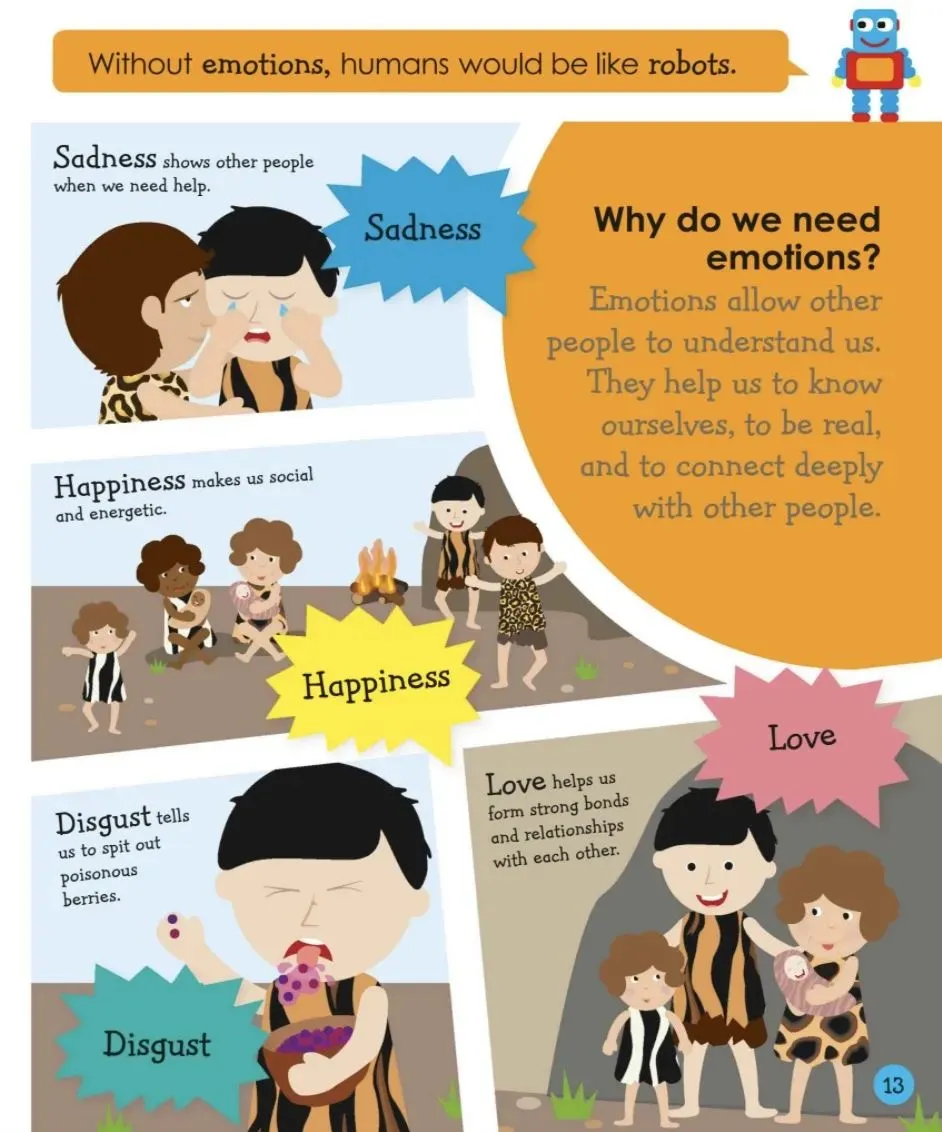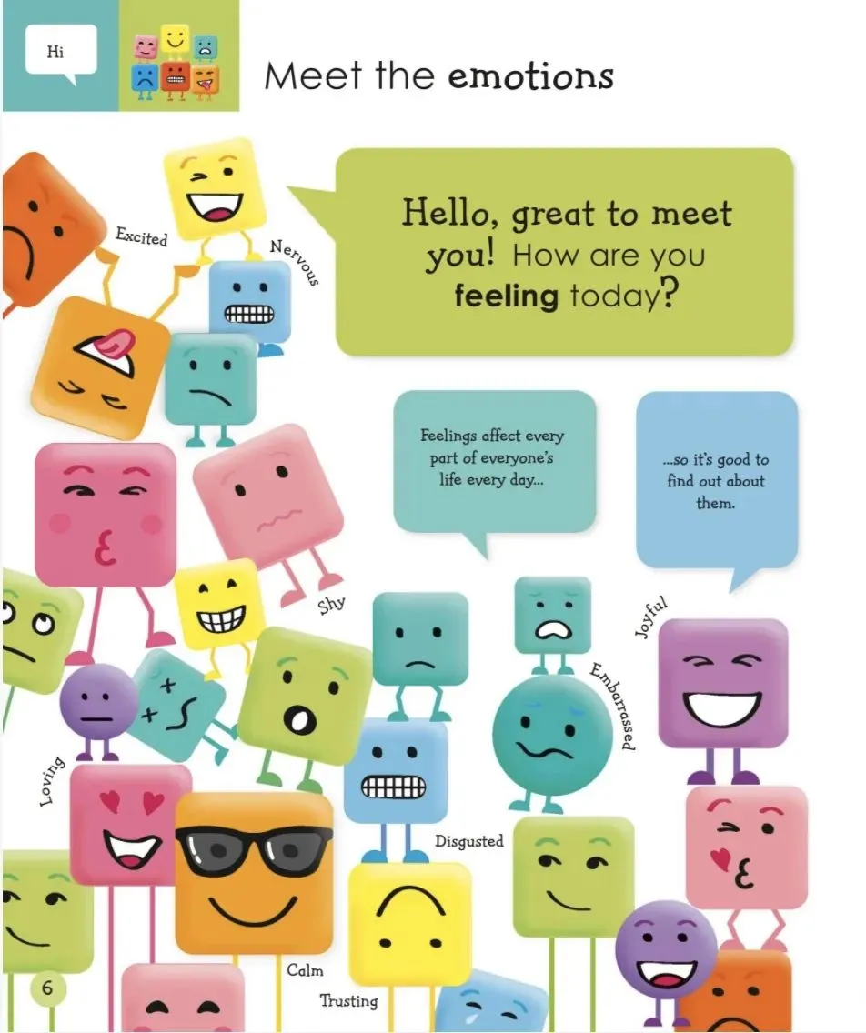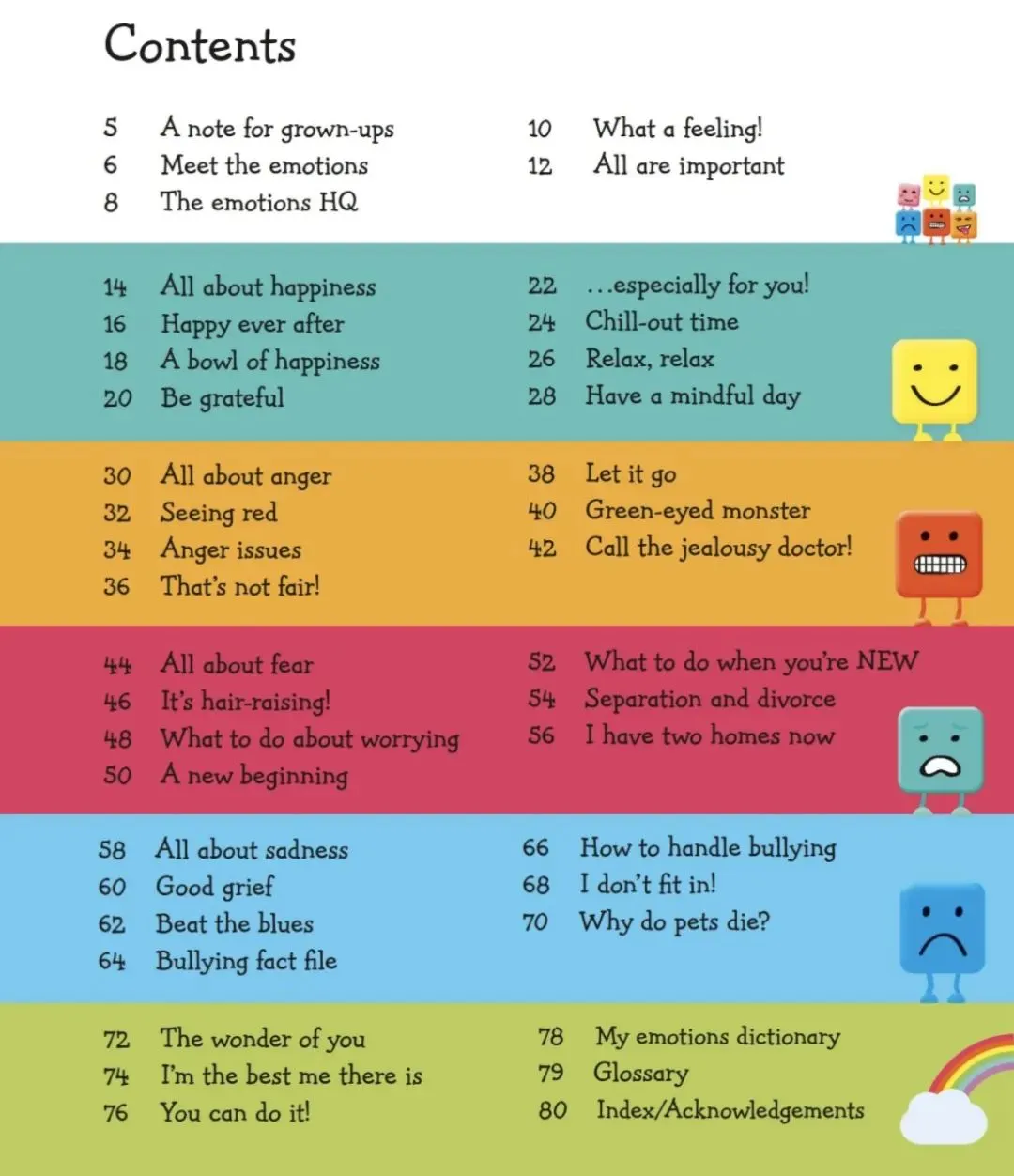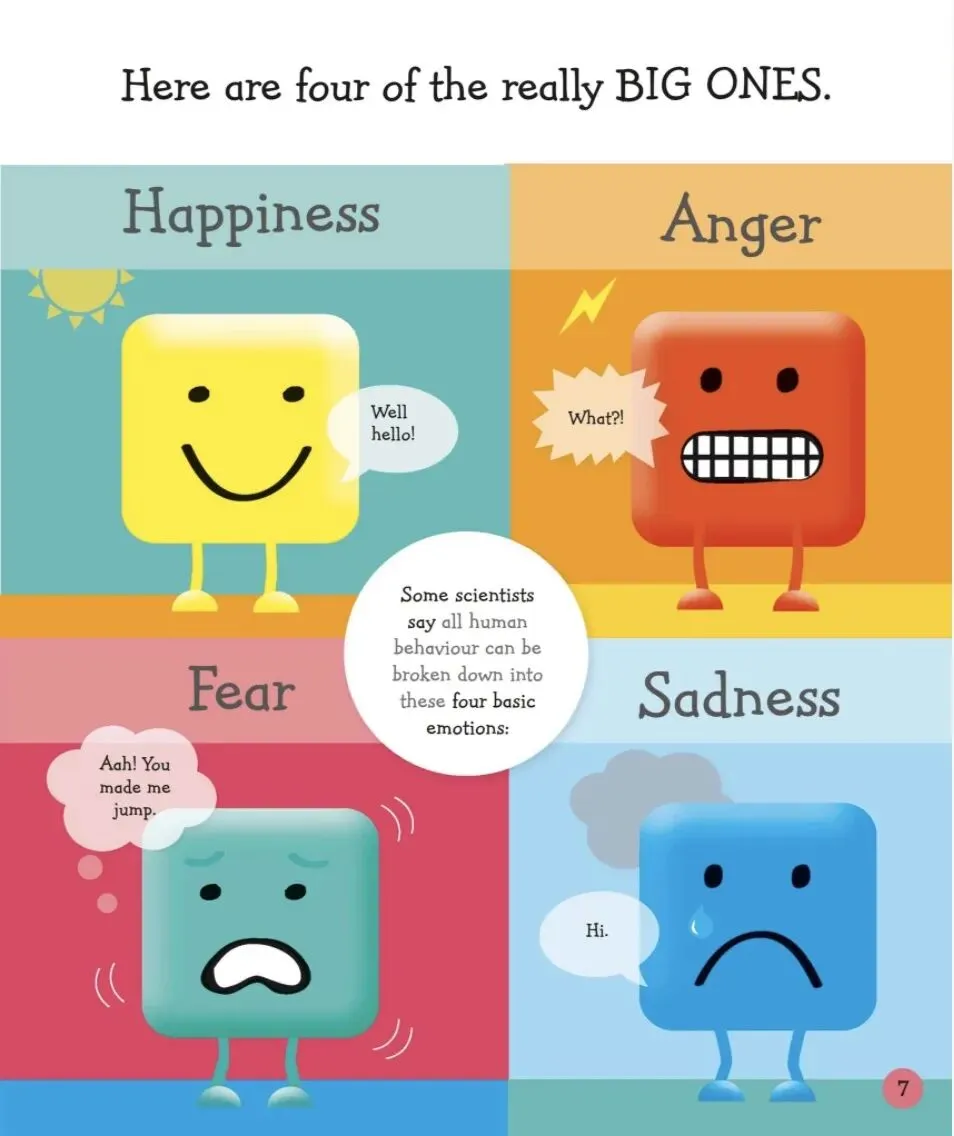 这本书包含六章:介绍、快乐、生气、害怕、伤心、你,介绍了很多不同感情和它们产生的一般情况。
