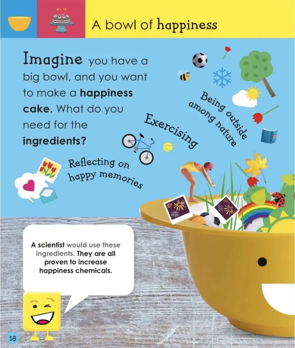 除了基本的四种情感以外,也涉及了嫉妒、担心、郁闷、孤独等情感,内容不仅涉及孩子一般日常生活中的场景,也包括了父母离婚、宠物死亡、受到凌霸等场景,教孩子们找到让自己快乐的事,学习放松自己的方法,认识和理解不舒服的情绪,练习自我控制的方法。了解如何获得帮助,培养自信……书中内容表现形式多样,包括图解、漫画、运动指南、问答思考、活动组织、表格、小贴士等等。