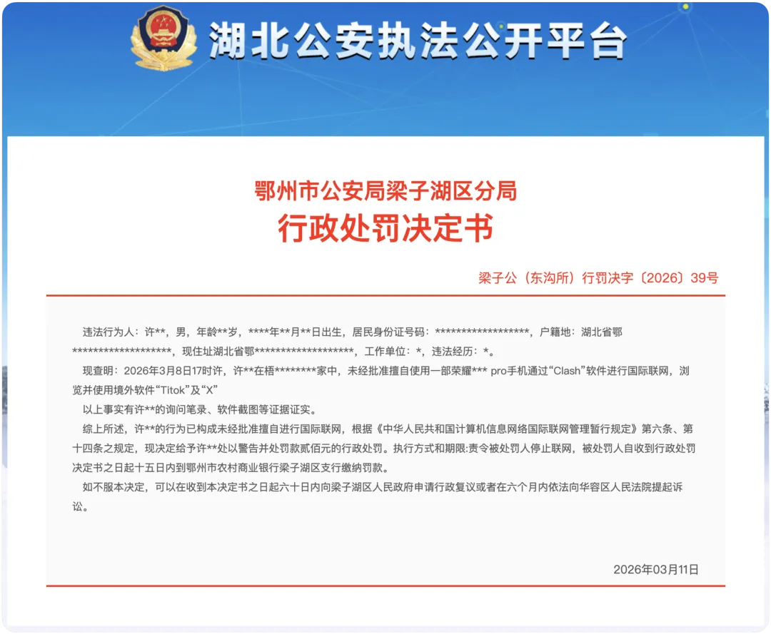 「 2026年3月8日17时许,许**在梧********家中,未经批准擅自使用一部荣耀*** pro手机通过“Clash”软件进行国际联网,浏览并使用境外软件“Titok”及“X”,现决定给予许**处以警告并处罚款贰佰元的行政处罚 」