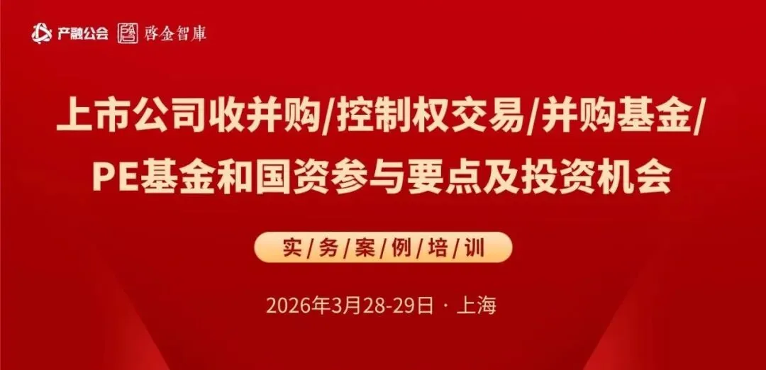 产融公会 & 启金智库将于 2026年3月28-29日(周六/日)在 上海 举办 《上市公司收并购、控制权交易、并购基金、私募基金和国资参与要点及投资机会专题培训》,本期特邀4位行业实战派资深人士主讲分享最新经验和案例,本次是我们主办的上市公司并购重组重整专题2026年第3期、2025年已举办10期、2024年已举办6期,助力提升认知、掌握实操、适选标的、紧密设计、解决难点、聚合伙伴、捕捉投资,诚邀您的参加。