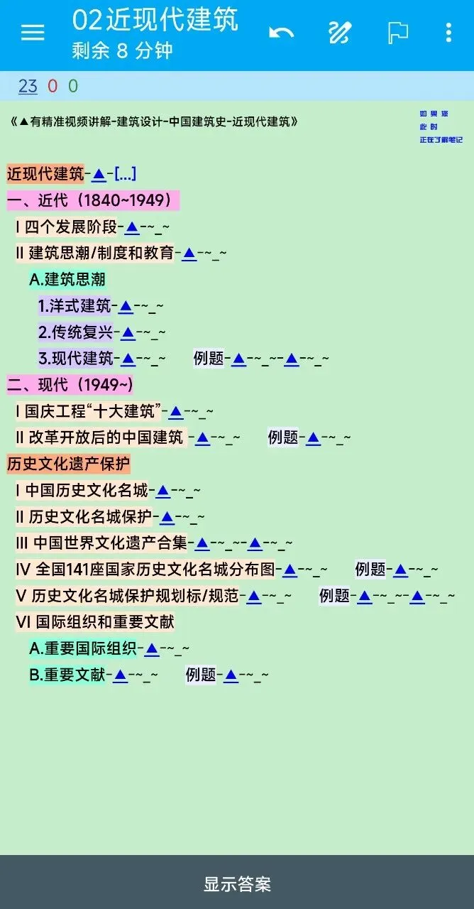 每个复杂知识点旁,都有一个蓝色三角号▲。点击即可观看2-3分钟的精讲视频,直击“建筑力学计算”、“绿建设计”等核心难点,实现“哪里不会点哪里”。