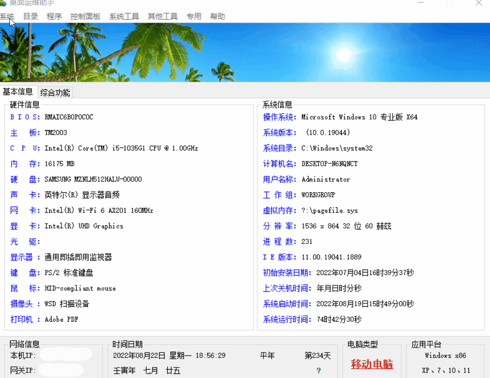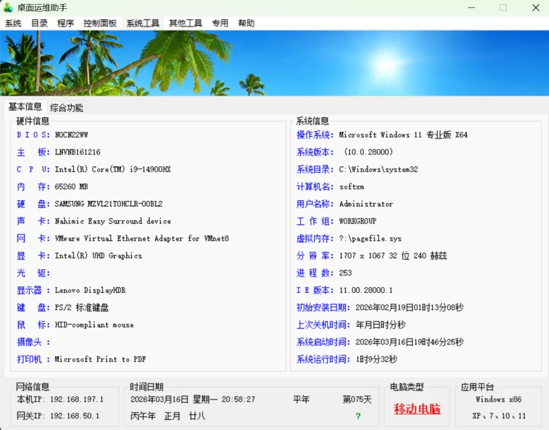 桌面运维助手是一款集成Windows系统优化、设置与管理功能于一体的轻量级工具箱软件,绿色免安装,单文件运行,适用于Win7~Win11系统,能一站式解决硬件检测、系统修复、文件管理等常见电脑问题。