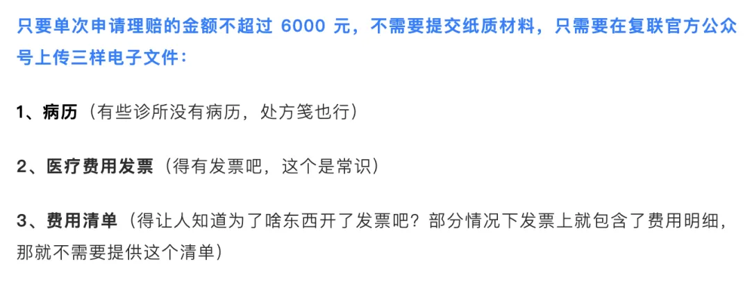 基本上常规每次简单疾病看病自费都不会超过6000元的,所以基本上绝大多数的医疗理赔都是可以线上公众号搞定。