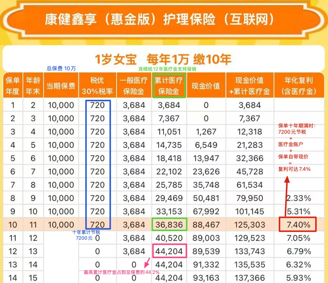 大家从可以图中看到,对于 1 岁女童 1 万十年交的情况下,前 12 年里的每年拨付可以支持报销的医疗金是 3684 元(这个已经是占了每年保费的 36.84%了,比例可以说是相当高了),十年交费结束的时候,10 年累计的医疗金可以报销的额度已经达到 36836 元(达到了总保费比例的 36.84%),如果等到全额 12 年的医疗金额度,那就是累计达到了 44204 元(也就是总保费的 44.2%,相当可观了)。