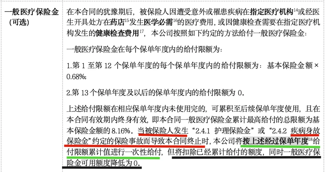 而条款划线部分的解读就是:犹豫期后人真的不幸疾病去世了(红线部分),你交了几年保费,那么那几年累计下来的医疗金将一次性理赔给家人(绿线部分),但是需要注意,如果之前有使用过 x 元的医疗金,那么之前说的累计医疗金一次性理赔金额,将会扣减 x 元(黑线部分)。