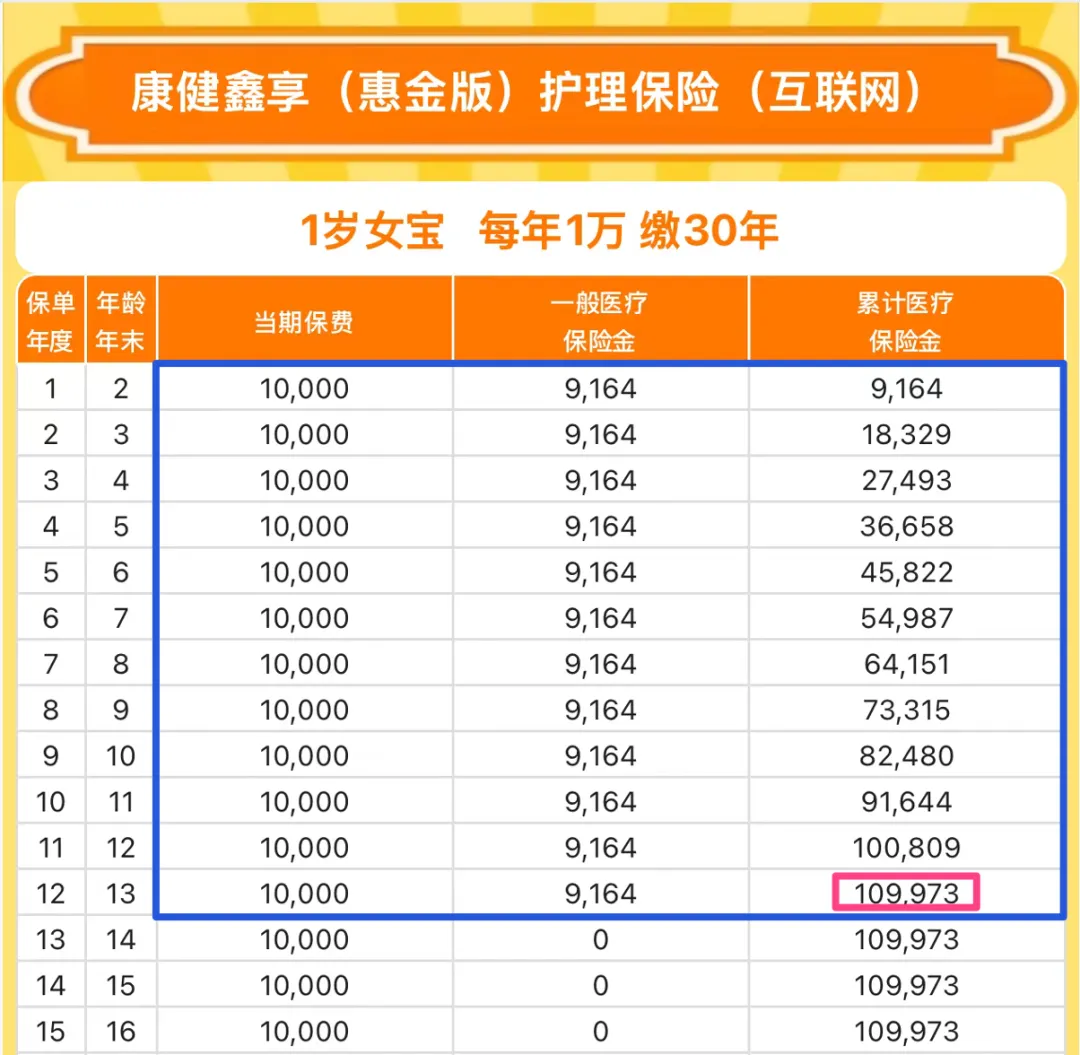 这还只是十年交的情况,前面说了惠金还支持 30 年交的,一样是给 12 年的医疗金,我给大家展示一下: