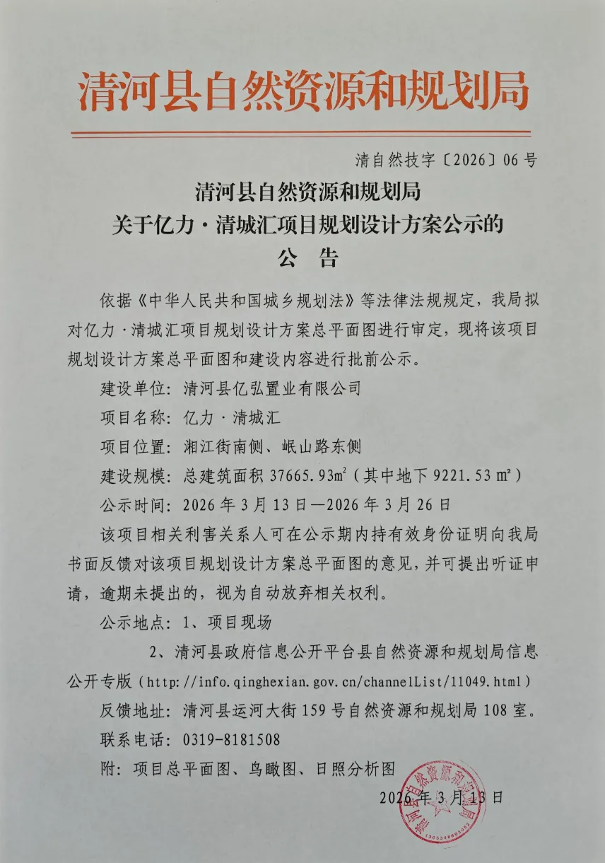 清河县自然资源和规划局关于亿力·清城汇项目规划设计方案公示的公告