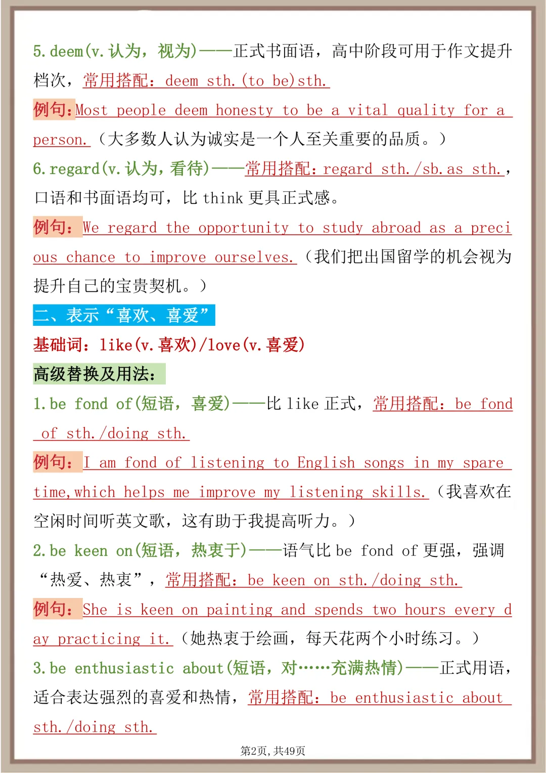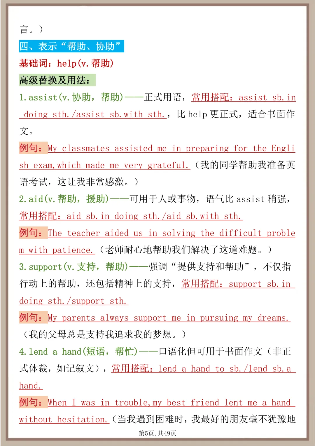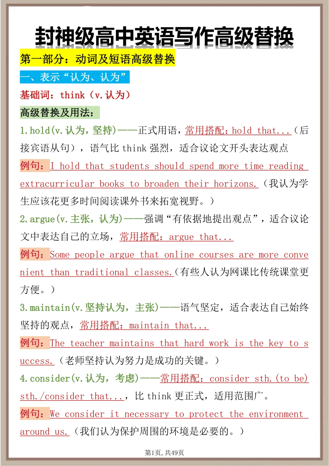 今天给大家整理了高考必备的【封神级高中英语写作高级替换】,覆盖议论文观点表达、记叙文情感描述、说明文场景说明等全体裁常考表达,附详细用法说明、例句解析,不管作文题目如何变式,都能精准应对,轻松提升作文档次、拿下高分!