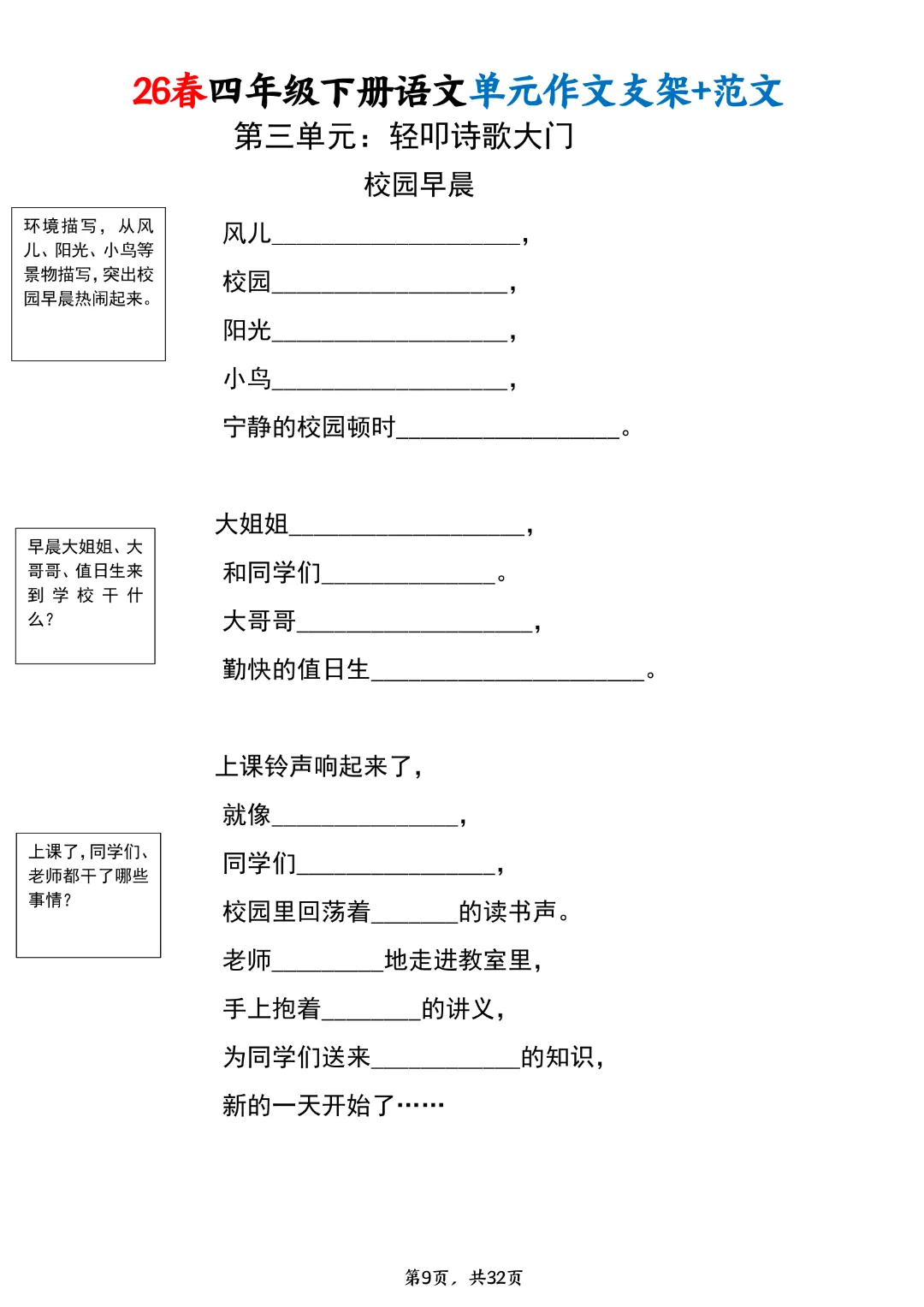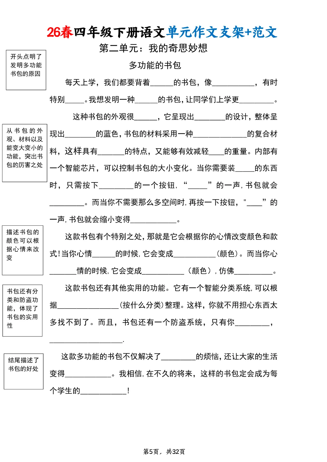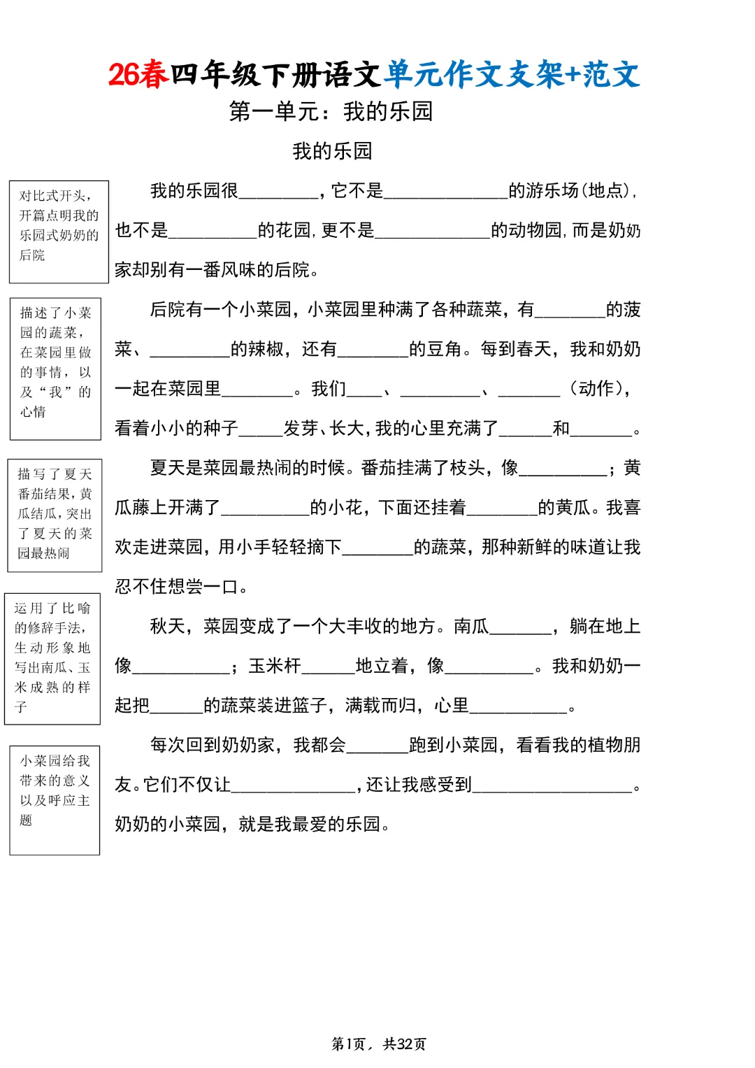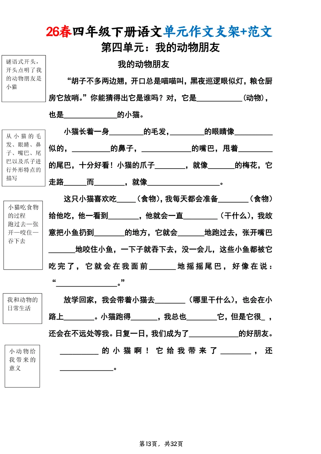 四年级下册语文【统编版】【第1-8单元作文支架+范文】我的乐园+我的奇思妙想+轻叩诗歌大门+我的动物朋友等丨完整高清可打印