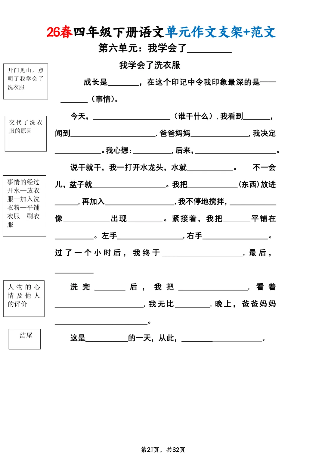 今天给大家分享的是:四年级下册语文【统编版】【第1-8单元作文支架+范文】我的乐园+我的奇思妙想+轻叩诗歌大门+我的动物朋友等丨完整高清电子版可打印