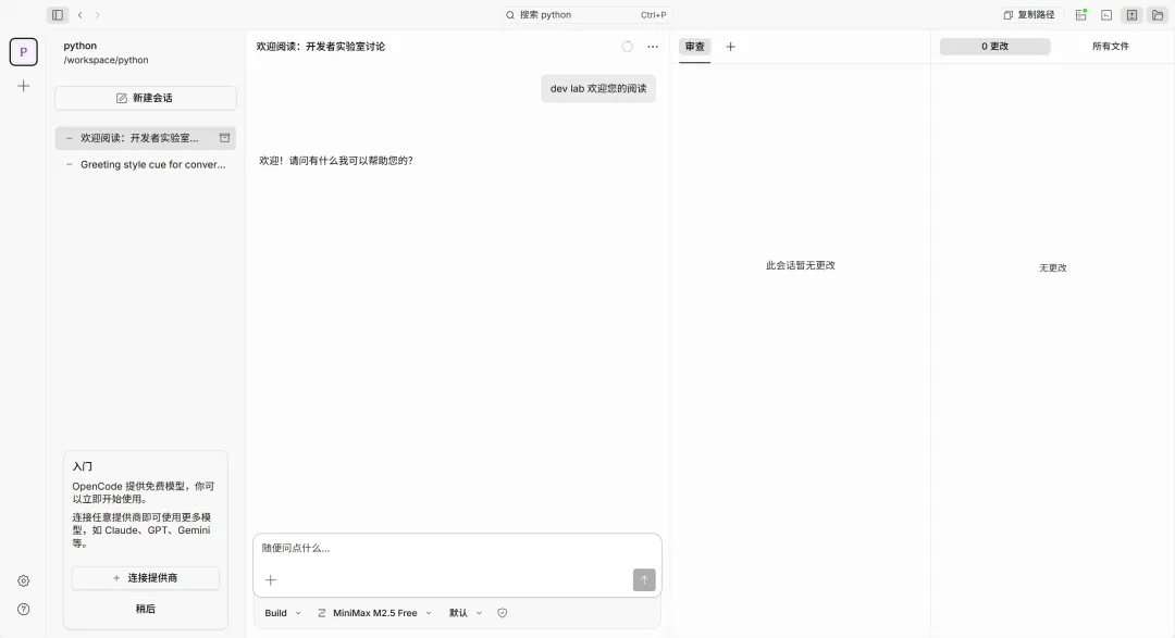 📌 无论选择哪种模式,核心的 Plan/Build 双模式、撤销重做、对话分享 等功能完全一致,可按习惯自由切换。