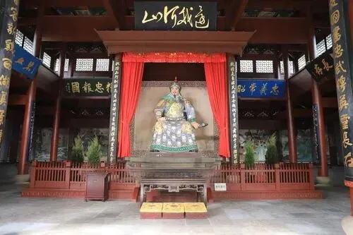 大殿内塑有岳飞彩色坐像,像高4.5米。殿中高悬“还我河山”匾额,为岳飞手迹,两侧有明代人所书“精忠报国”,中国佛教协会会长赵朴初所书“碧血丹心”以及西泠印社社长沙孟海所书“浩气长存”等匾额。 岳王庙建于南宋嘉定14年(1221年),西湖北山的智果观音院改为“褒忠衍福禅寺”,用以表彰岳飞的功业。
