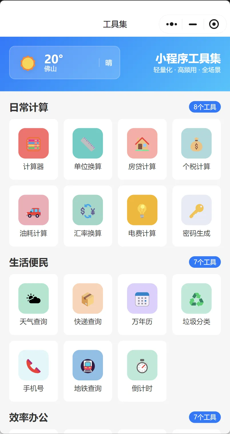 它的场景覆盖能力十分强大,仿佛一张细密的大网,将生活和工作的各个角落都紧密笼罩。小程序内部精心内置了丰富实用的工具,涵盖日常计算、生活便民、效率办公、趣味娱乐等多个领域。在日常计算方面,它就像一位精准无误的数学小天才,无论是简单的加减乘除,还是复杂的函数运算,都能迅速给出准确答案。生活便民工具则像是贴心的生活小管家,水电费计算,地铁查询,天气查询、快递单号追踪等功能一应俱全,让你轻松解决生活中的各种小麻烦。效率办公工具宛如专业的职场小秘书,文档编辑、日程提醒等功能助力你高效完成工作任务。而趣味娱乐工具就如同欢乐的魔法师,为你在闲暇时光带来无限乐趣,比如小游戏、笑话大全等。