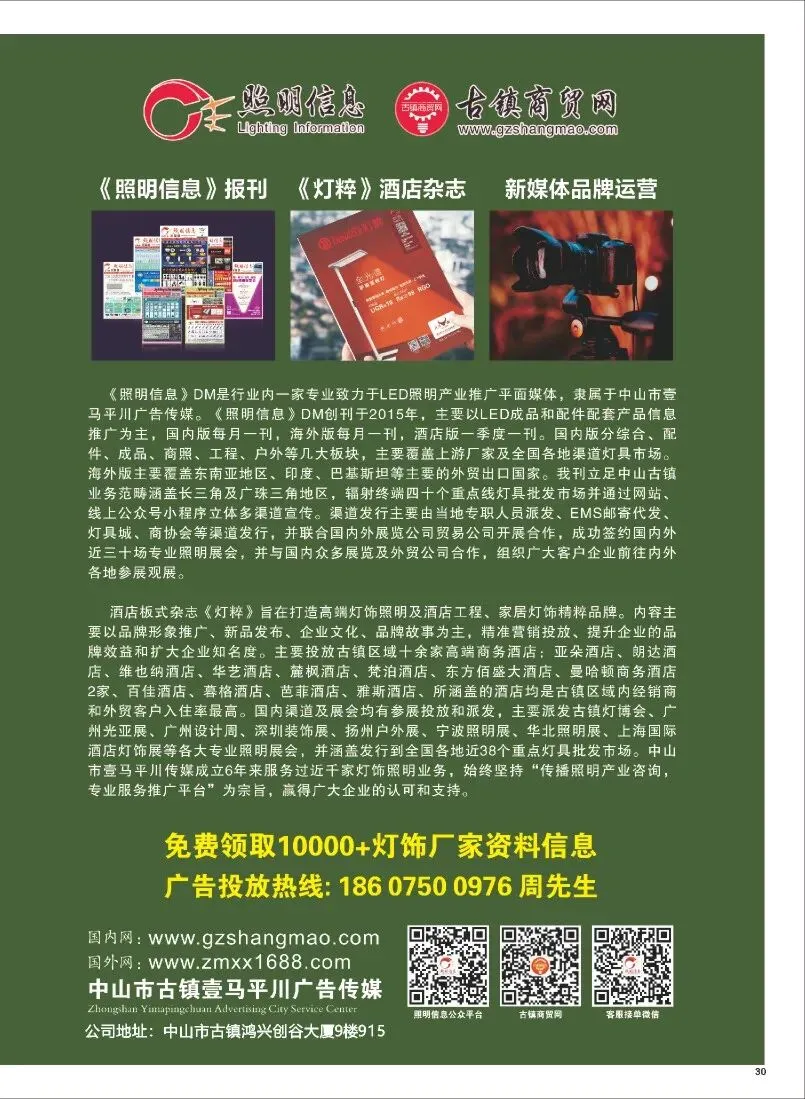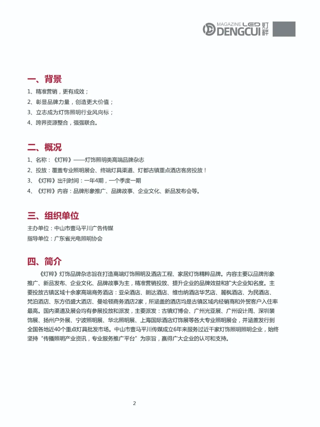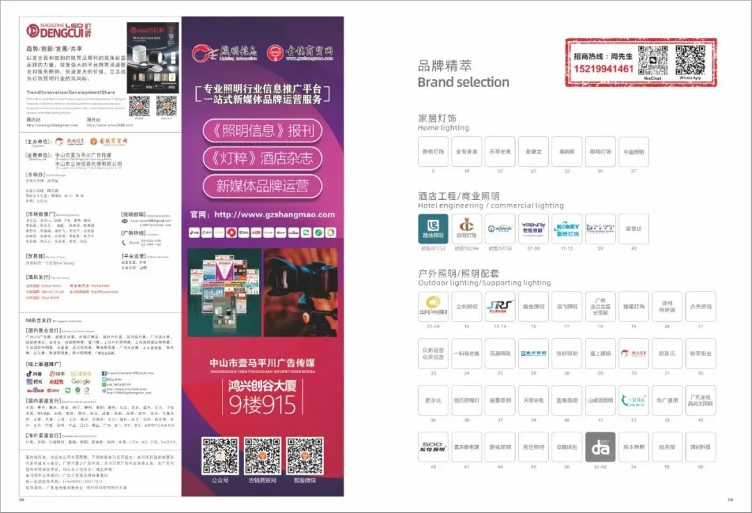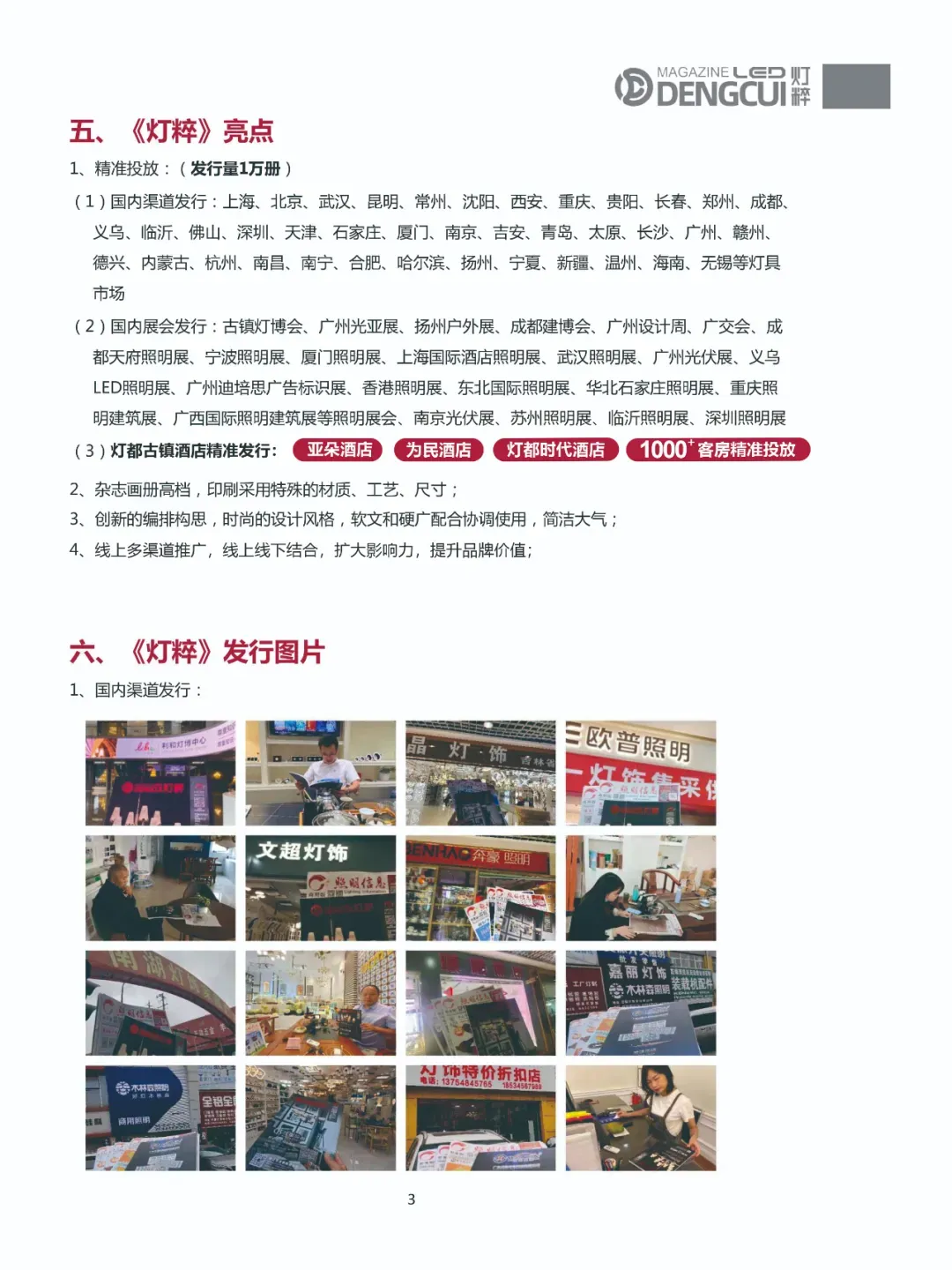 灯饰品牌照明杂志《灯粹》旨在打造高端灯饰照明及酒店工程、家居灯饰精粹品牌。内容主要以品牌形象推广、新品发布、企业文化、品牌故事为主,精准营销投放、提升企业的品牌效益和扩大企业知名度。主要投放古镇区域十余家高端商务酒店:亚朵酒店、朗达酒店、维也纳酒店华艺店、麗枫酒店、为民酒店、梵泊酒店、东方佰盛大酒店、曼哈顿商务酒店2家、百佳酒店、暮格酒店、芭菲酒店、雅斯酒店,所涵盖的酒店均是古镇区域内经销商和外贸客户入住率最高。国内渠道及展会均有参展投放和派发,主要派发:古镇灯博会、广州光亚展、广州设计周、深圳装饰展、扬州户外展、宁波照明展、东北照明展、上海国际酒店商业照明展等各大专业照明展会,并涵盖发行到全国各地近40个重点灯具批发市场。