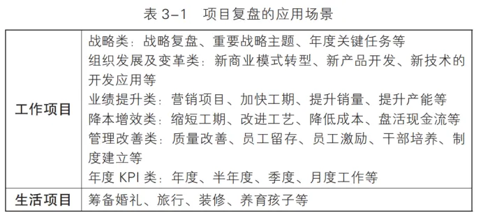 通过表 3-1,我们可以看出,一个项目一定具有以下四个特点:目标明确有价值,时间节点有要求,责权担当有专人,项目成本有预 算。当然,无论是工作项目,还是生活项目,其复盘原理都是一致的。