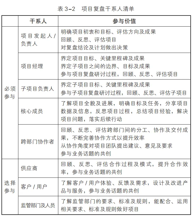 表 3-2 列举了项目复盘时必须参与及选择参与的干系人清单,其中必须参与的即为项目重要干系人。