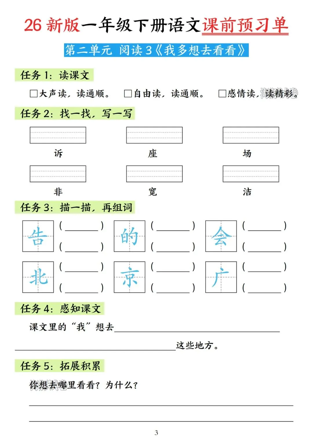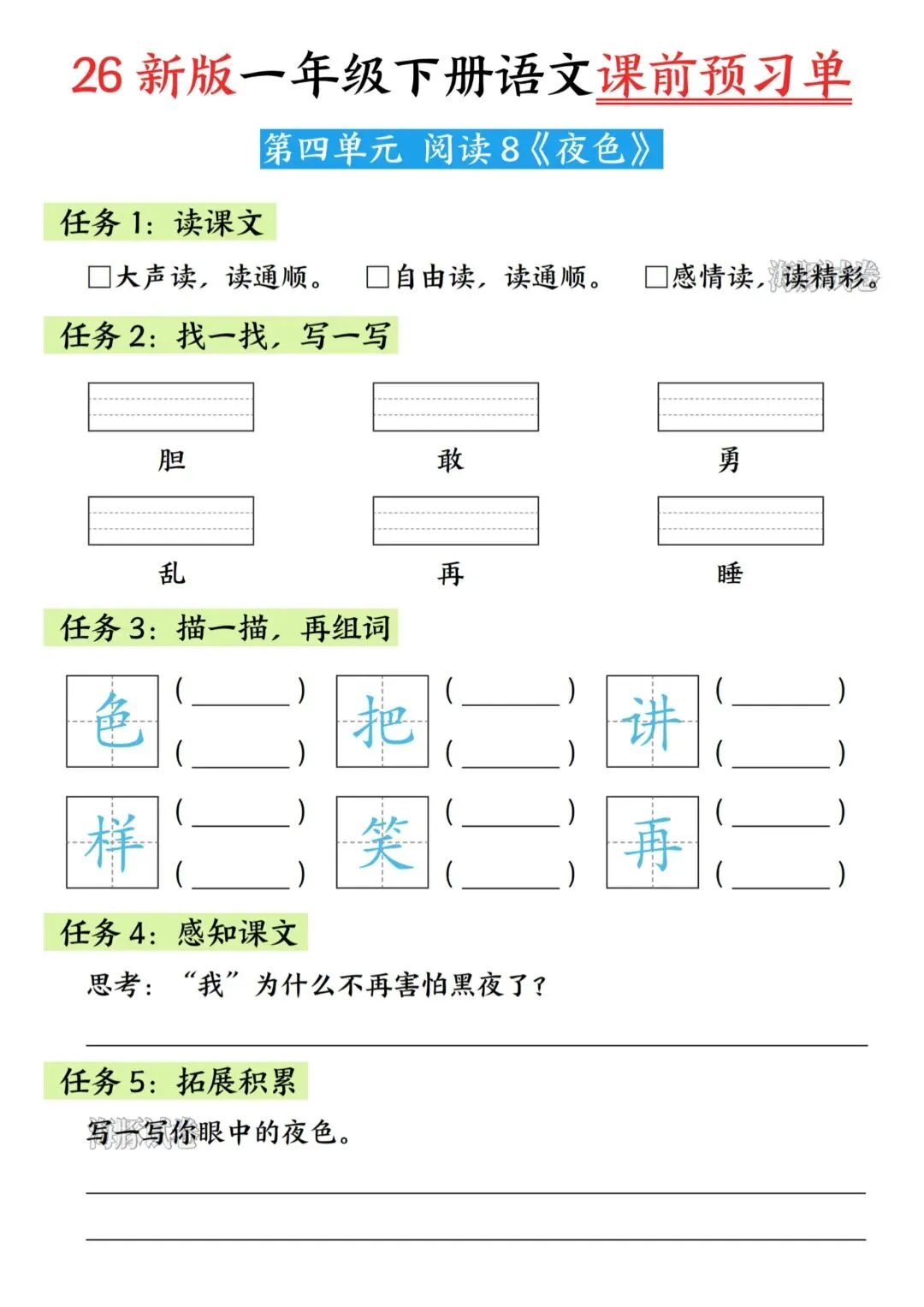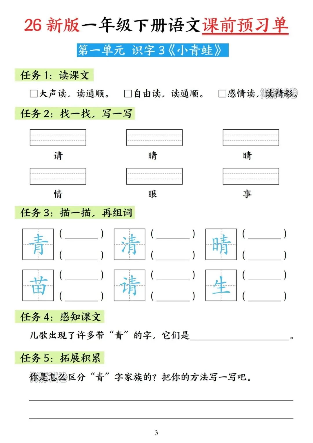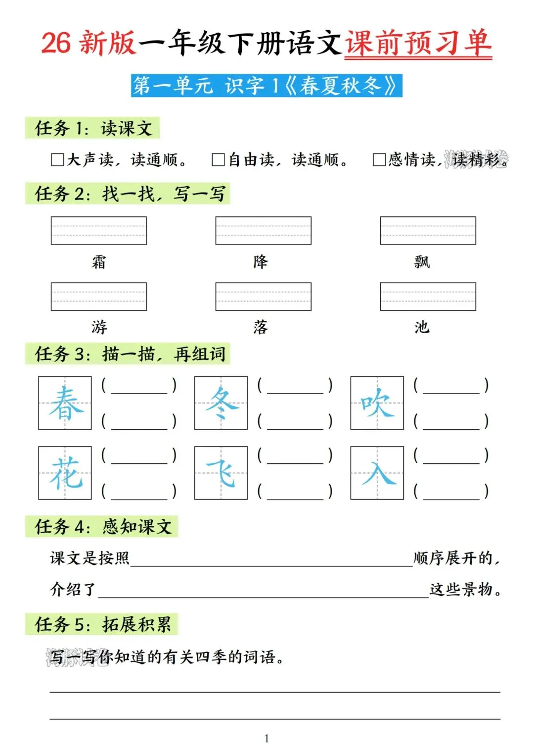 26春一年级下册语文课前预习单|完整电子版可打印。