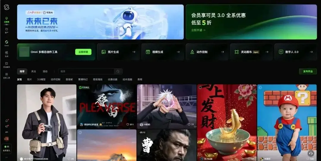 打开可灵 AI 即可看到非常丰富的功能以及不同的页面,还包括非常多的视频生成的效果展示。