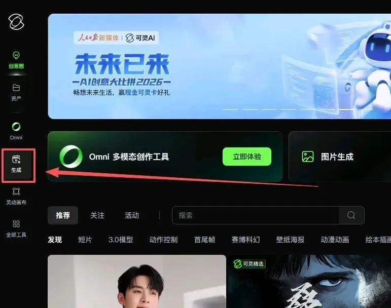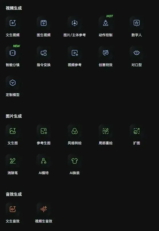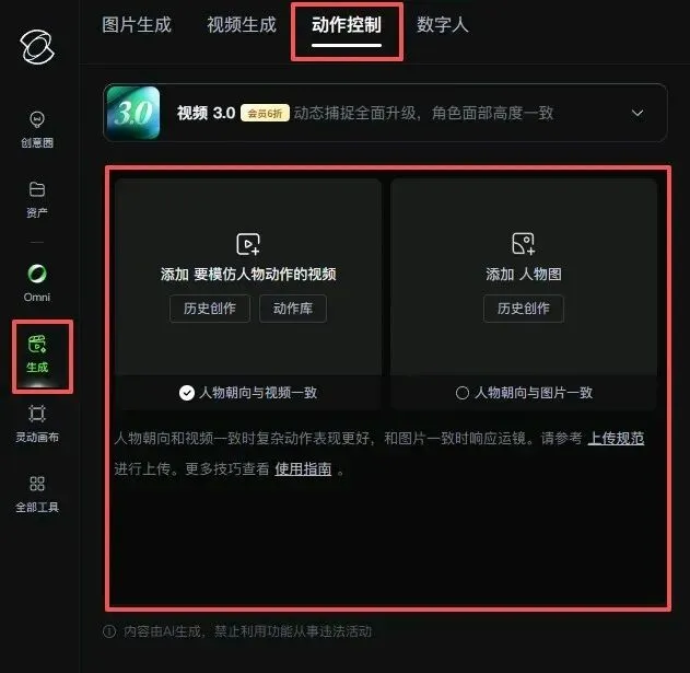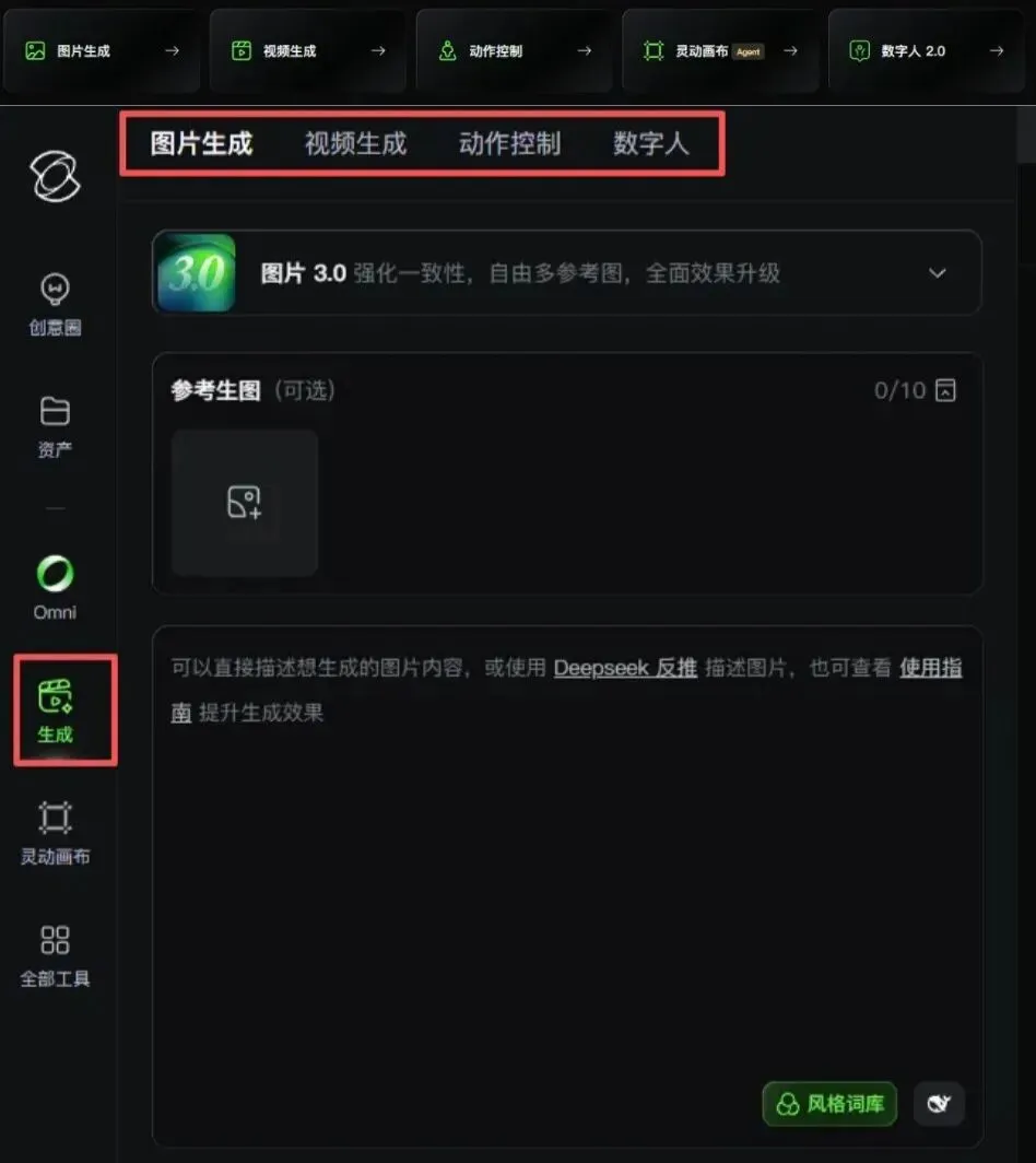 对于图片生成、视频生成、动作控制、数字人这些都在生成这一大分组中可以直接进入。