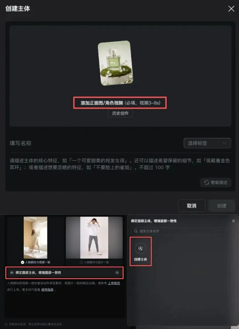 在下方还有一个绑定面部主体,这里是可以非常有效的控制人物面部细节,增强面部一致性,有条件可以通过一个短视频来创建一下。