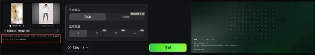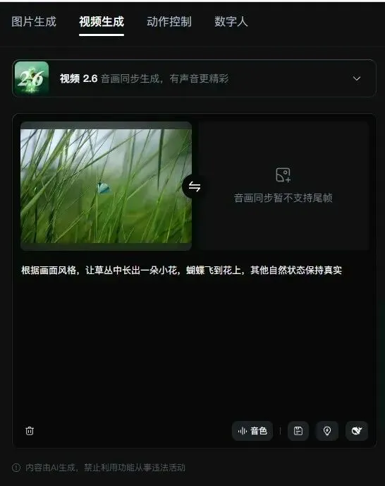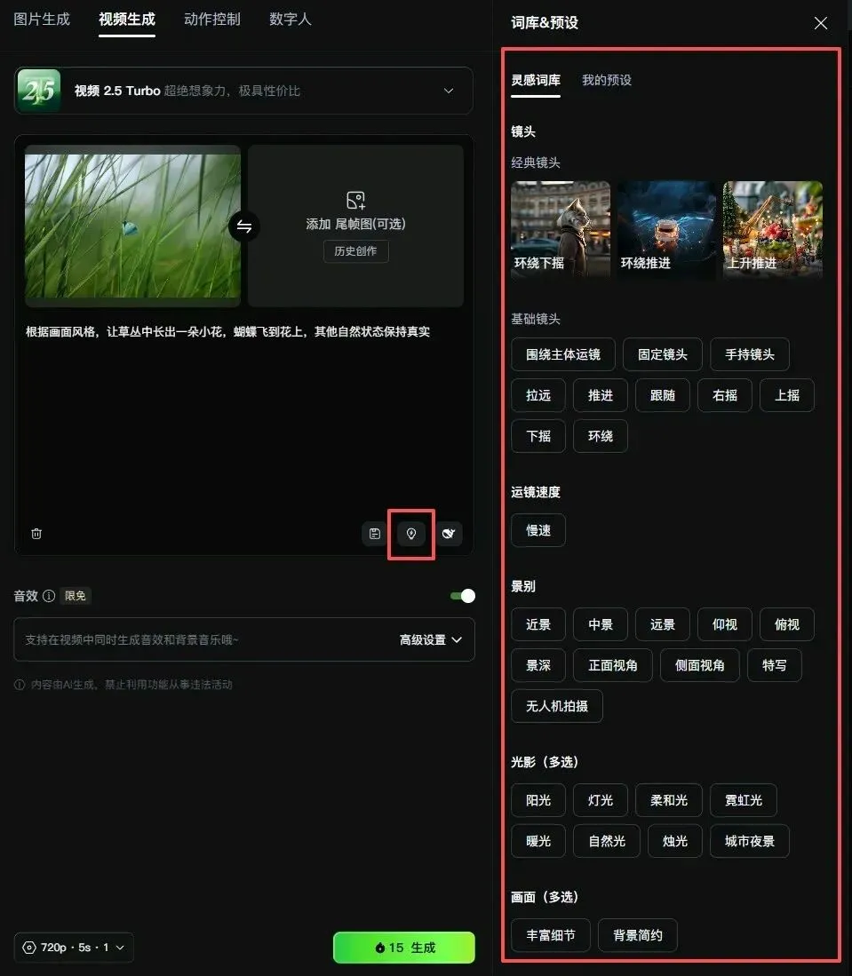 视频生成这里也是一样,可以导入单张图片,或者导入两张图片作为首尾帧,输入提示词,可以选择词库和预设以用来提升画面更多细节,最后点击生成。