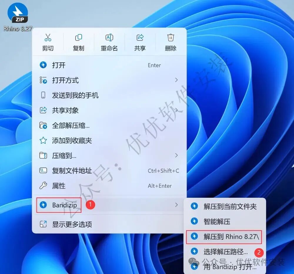 1、下载Rhino 8.27软件安装包到电脑上,右键选择【解压到Rhino 8.27\】