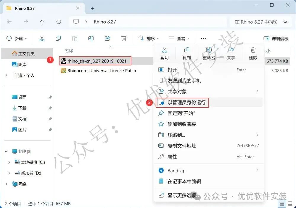 8、回到Rhino 8.27文件夹,找到【Rhinoceros…Patch】程序,右键选择【以管理员身份运行】它