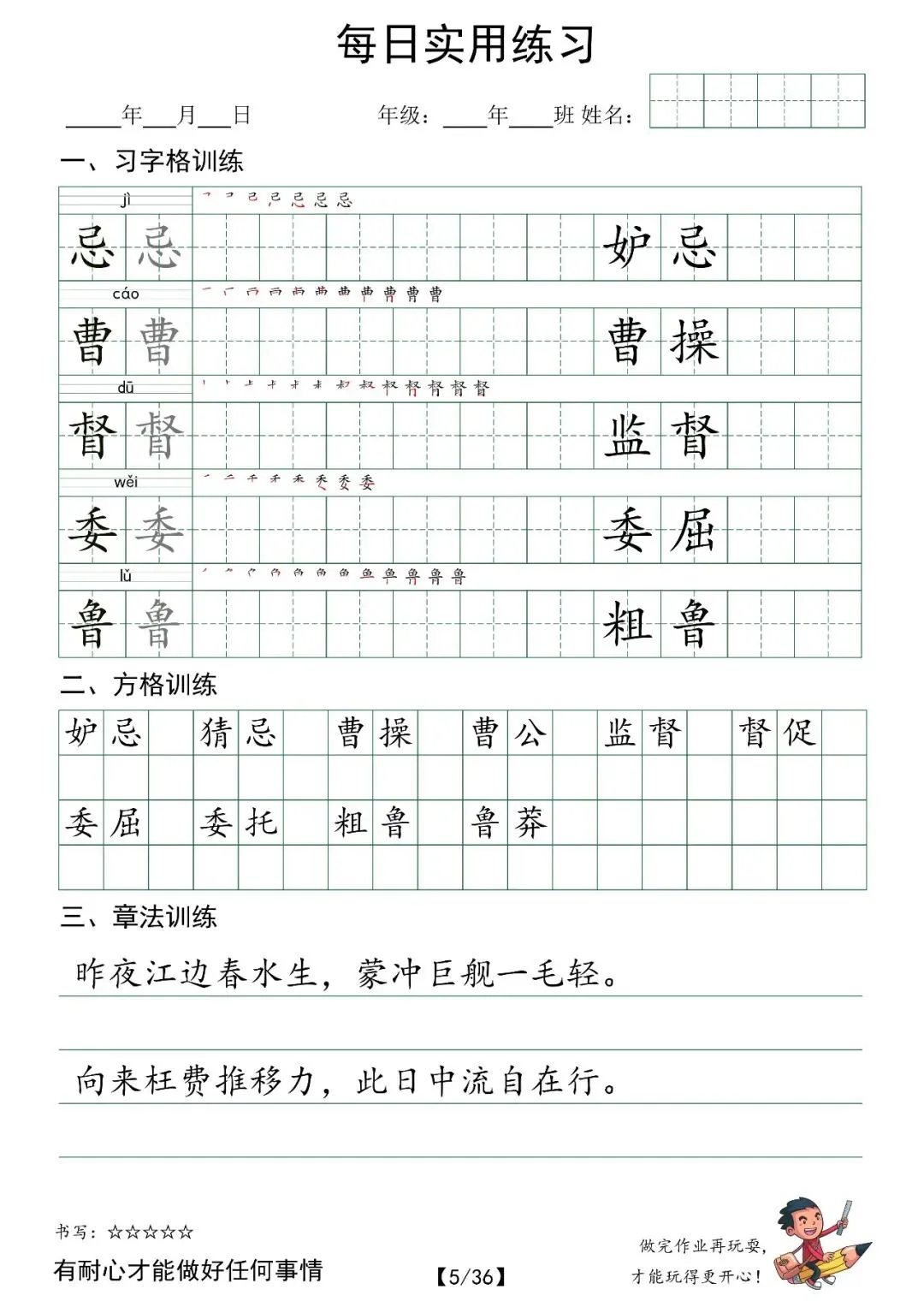五年级下册语文每日实用字帖练习,电子版可打印