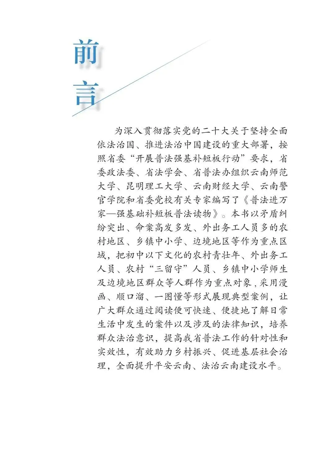 按照普法强基补短板专项行动要求,近日,云南省委政法委、省法学会、省普法办组织专家编写了《普法进万家——强基础补短板普法读物》。