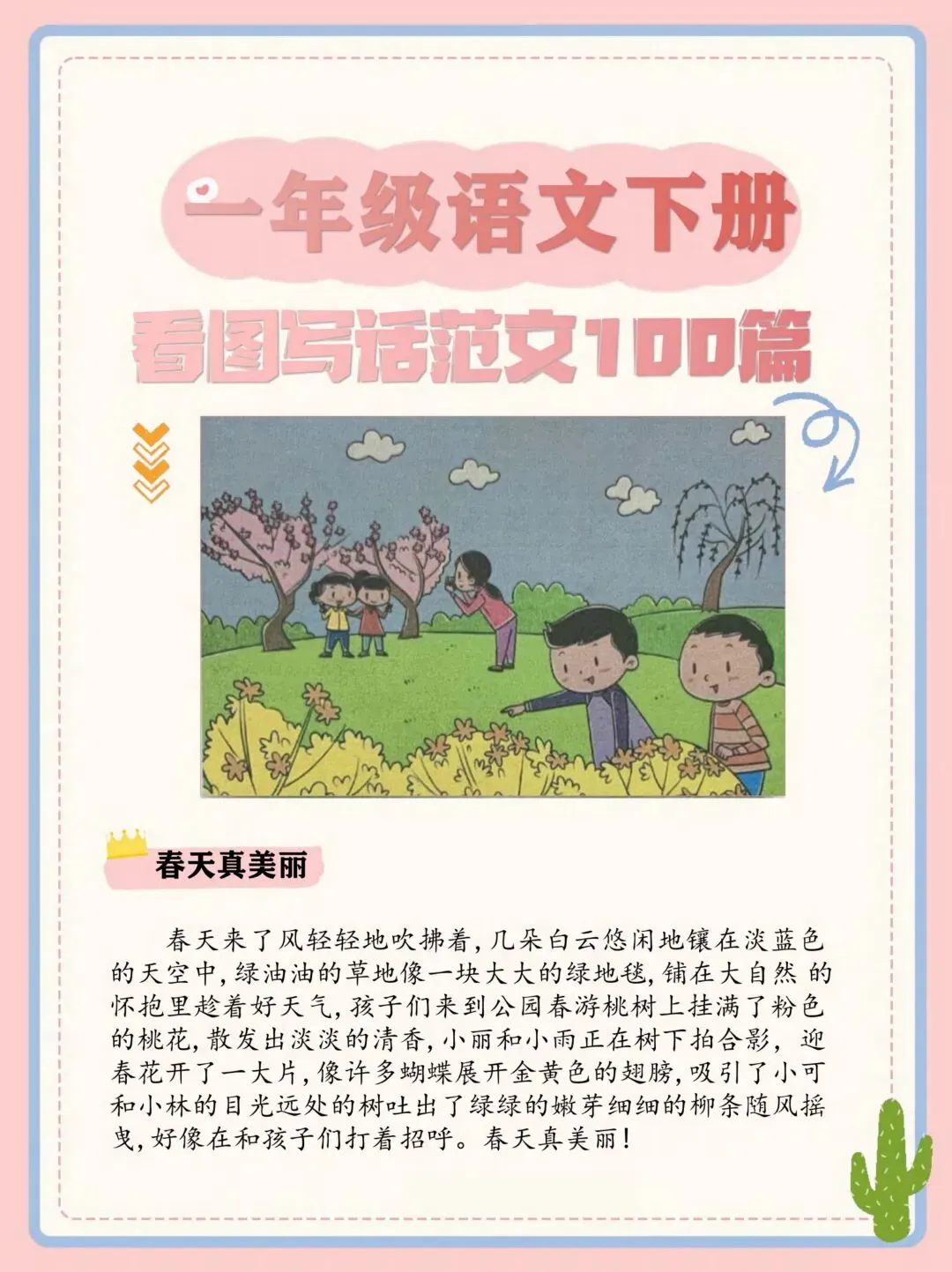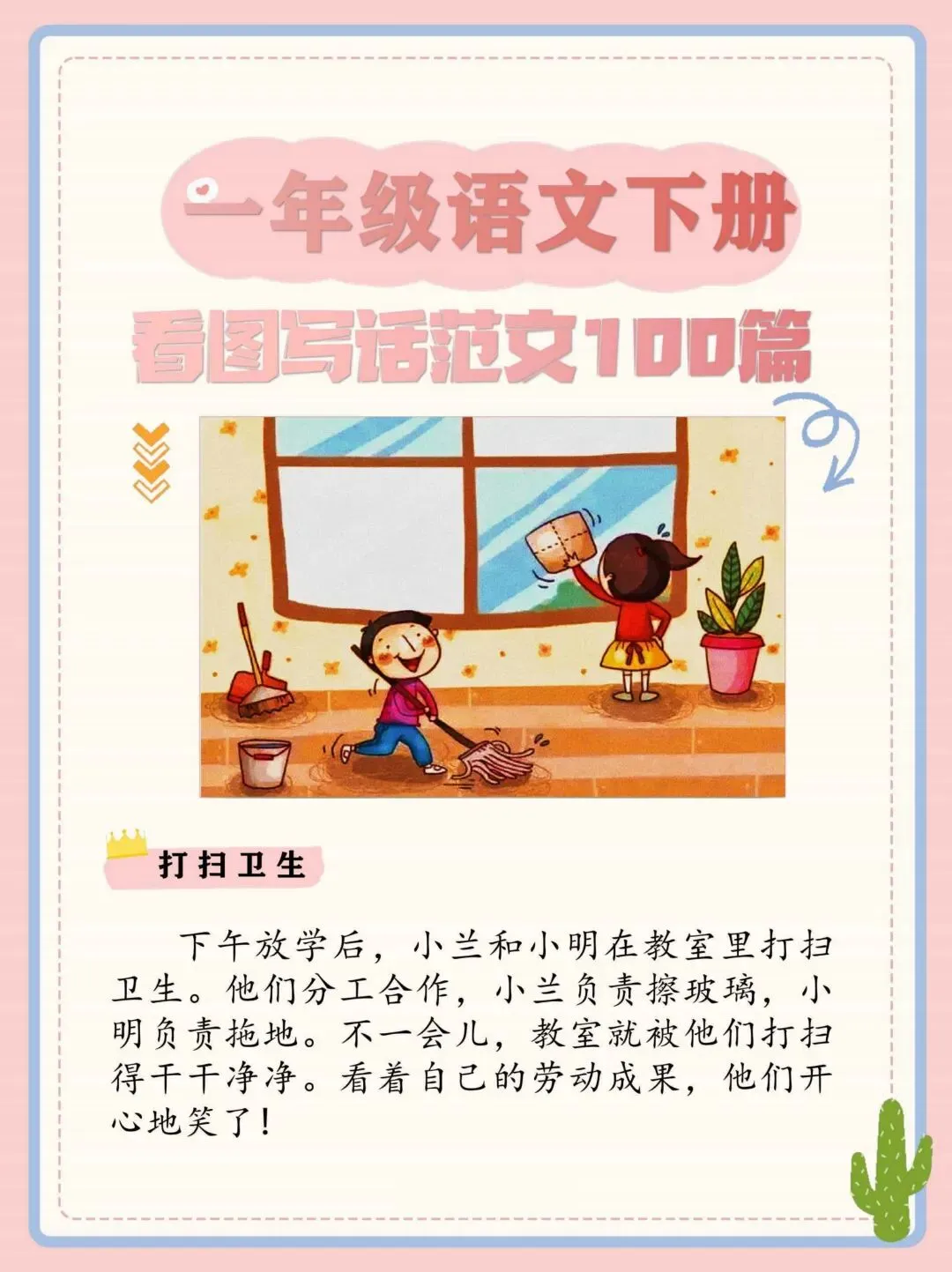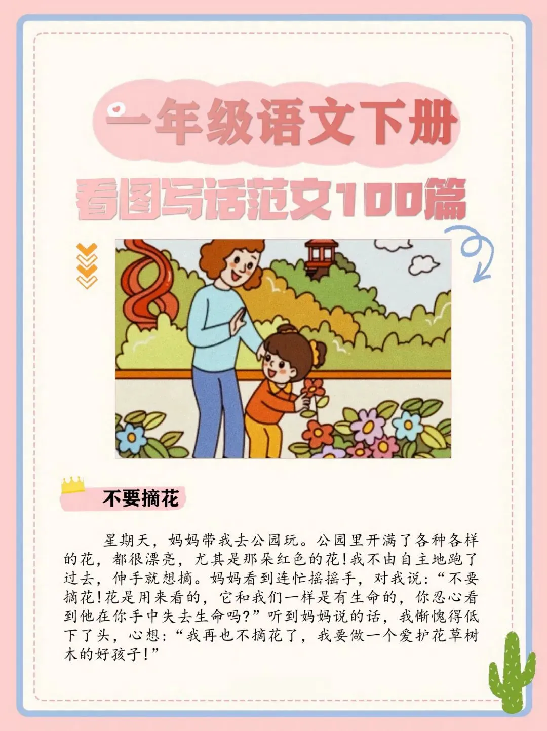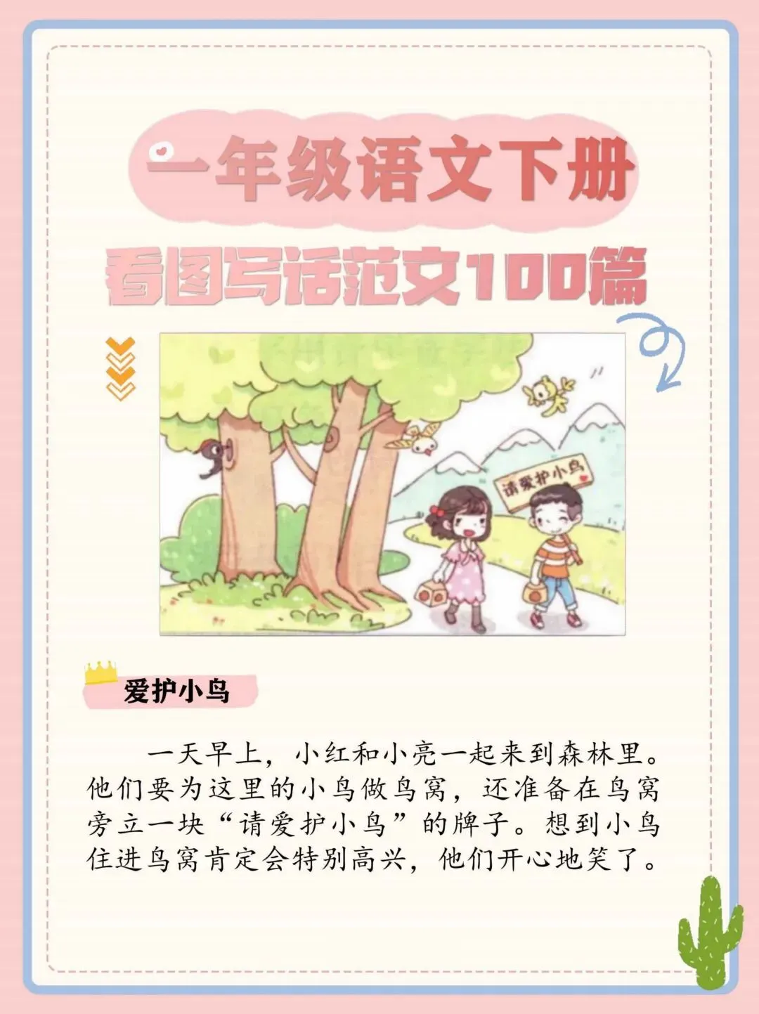 一年级看图写话常考范文100篇!可直接打印 关注我们 领取更多资料 🌈电子版可下载打印,需要的家长抓紧领取一份给孩子打印🖨️吧 (温馨提示:文末有完整电子版领取方式) 领取完整电子版: ①:点一点右下角的“赞”和“在看”,感谢 ②:首先【关注】公众号,再点【发消息】输入编号:39号资料 分享小学拔尖资料 爱润童心,智引成长