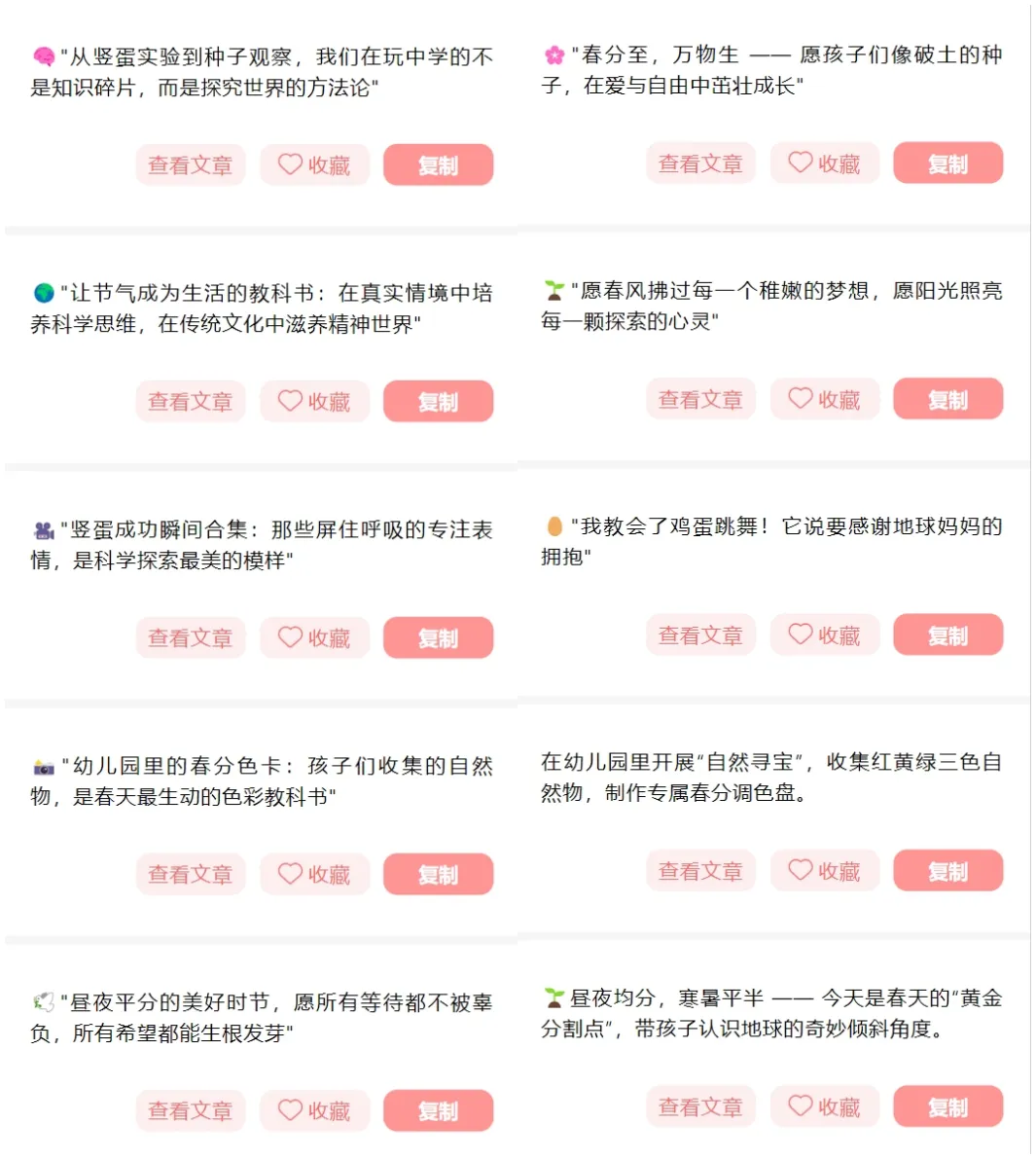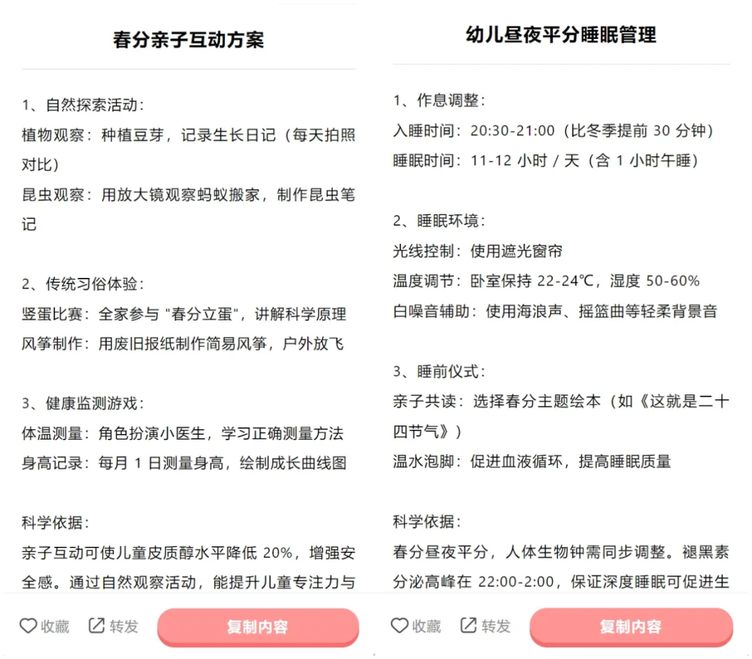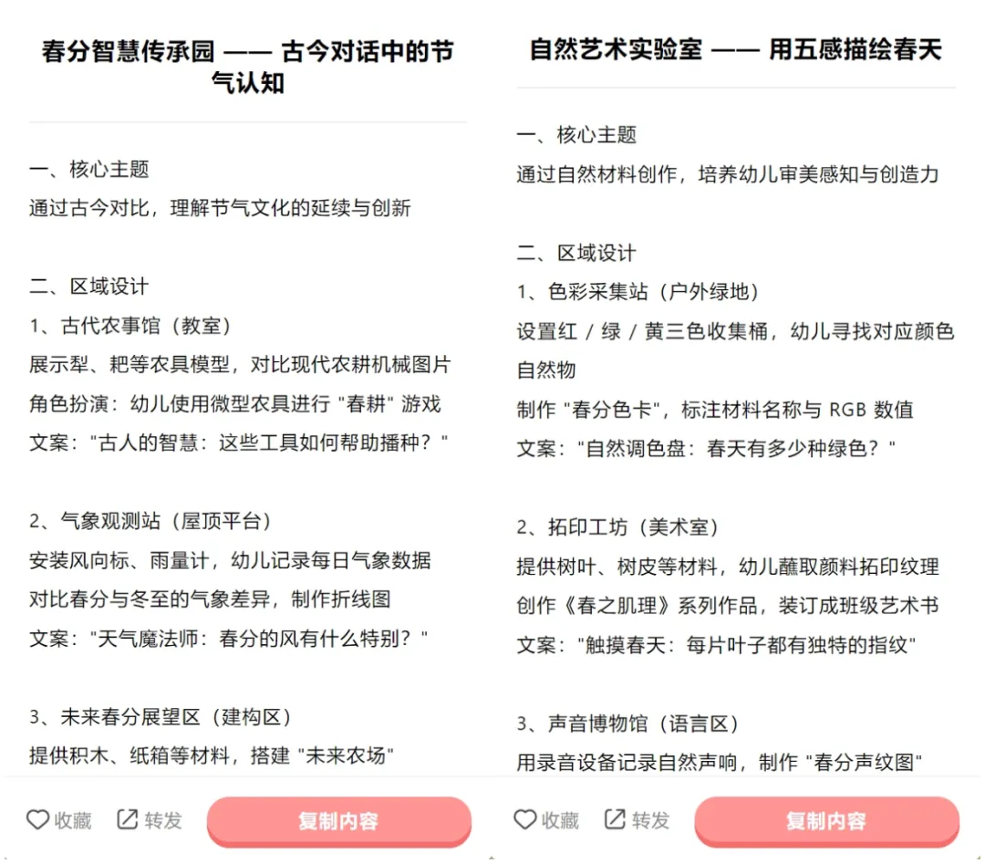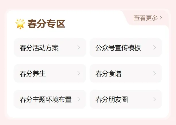 园长文案库上线“春分专区”,内含活动方案、春分健康指南、环境布置创意、春分食谱、活动报道公众号模板文章、朋友圈文案等,助力园长用低成本、高价值的节气活动打造差异化竞争力。