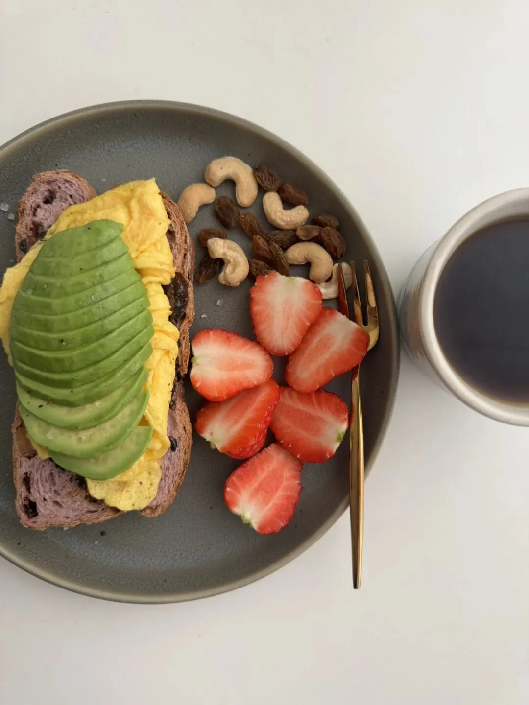 厚切的牛油果片,铺在吐司上与滑蛋相拥,口感醇厚又清爽;蓝莓、草莓、无花果、阳光玫瑰葡萄,各色鲜果点缀,不仅颜值拉满,更带来满满的维生素与膳食纤维。