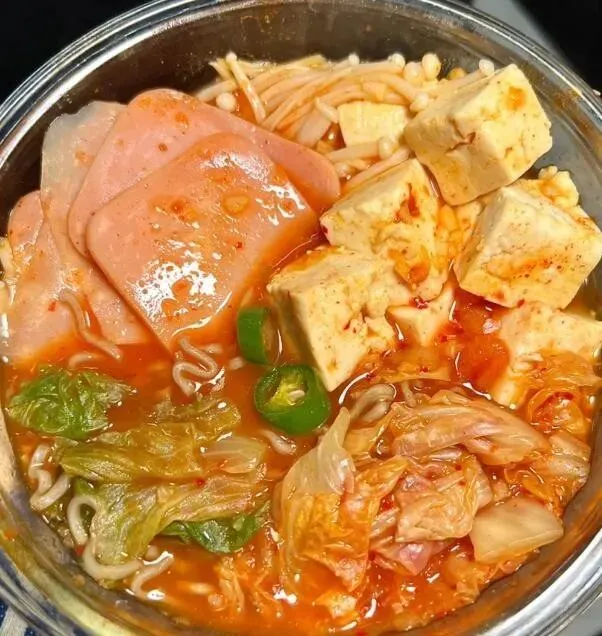 荞麦方便面压底 , 铺上生菜金针菇火腿泡菜豆腐 , 加辣酱生抽蚝油蒜末 , 倒500ml水 , 高火7分钟~