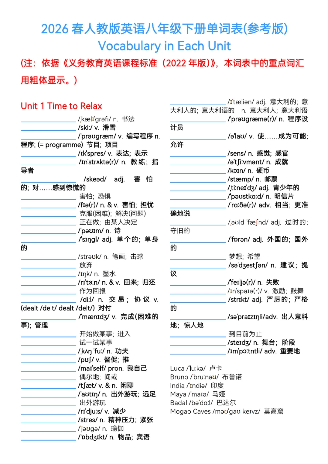 【免费下载】八年级(下)英语 2026春八下单词表(参考版)《人教版》,PDF电子版,共9页,可打印