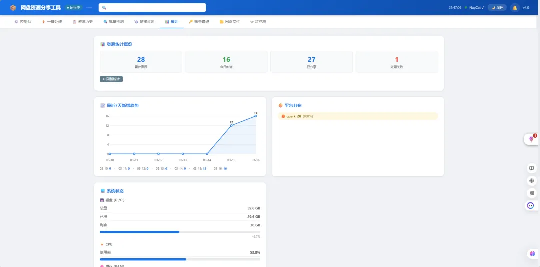 — 返回 daily_7days,platform_dist,hour_dist,retry_queue_*,cookie_health,share_dedup_count,total_30days