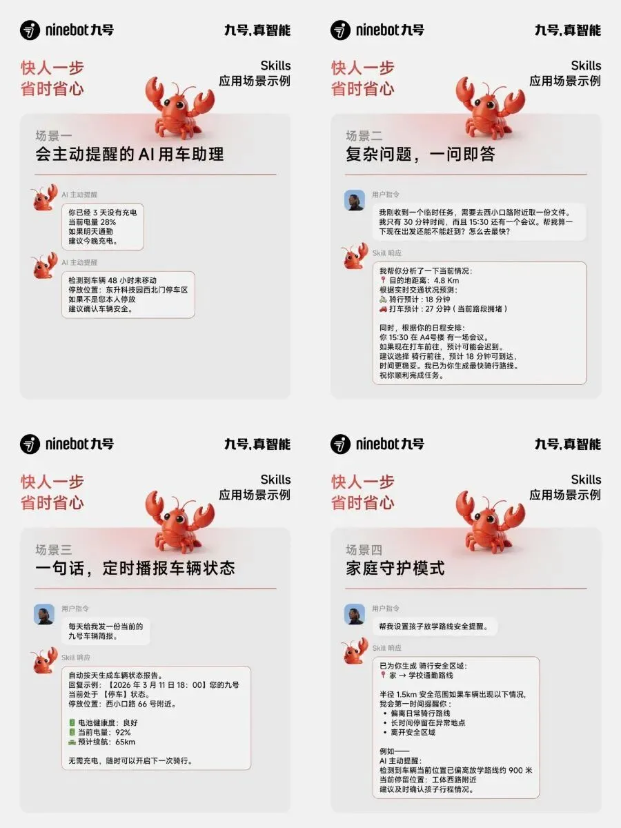 核心功能:接入后,AI成为用户的 “AI用车助理” 。它能实现主动提醒(如长时间未充电提示补能、车辆异常停放预警)、复杂出行决策辅助(结合实时路况对比骑行与打车效率)、定时播报车辆状态报告(电量、续航、位置),以及家庭守护(为孩子设置安全骑行区域)等功能。