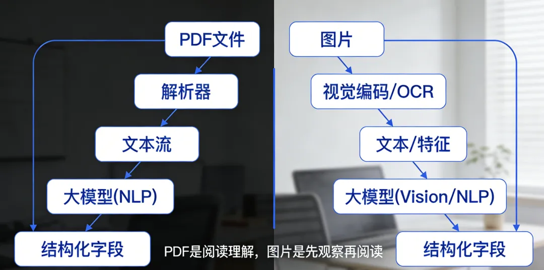 ·是什么:PDF识别是「阅读理解」,图片识别是「先观察再阅读」;端到端多模态 vs OCR+文本抽取,是两条不同的技术路线。