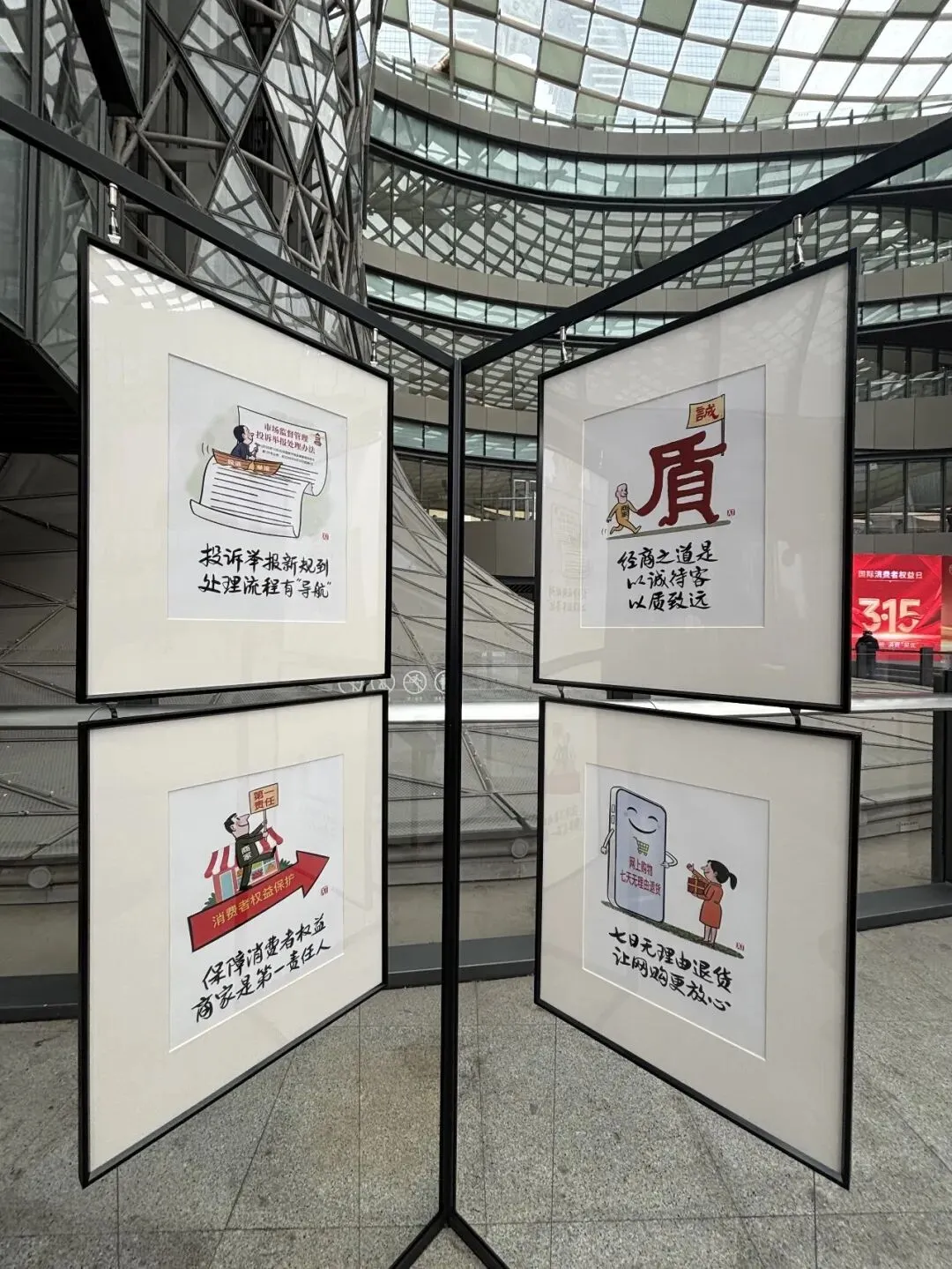 这次宣传活动里,有一个小小的亮点,举办了由我创作的消费者权益保护主题公益漫画展。