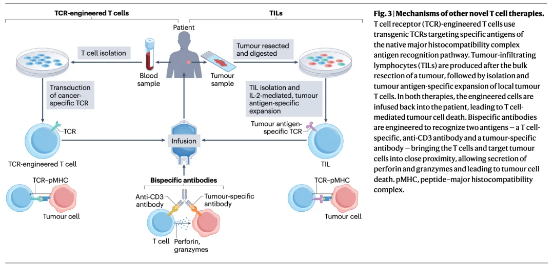 图3 | 其他新型T细胞疗法的机制: 该图通过三个并列的示意图,分别阐述了T细胞受体工程T细胞、肿瘤浸润淋巴细胞和双特异性抗体的作用机制。TCR-T利用转基因TCR识别由主要组织相容性复合体呈递的细胞内抗原。TIL疗法通过切除肿瘤、分离并扩增其中的肿瘤抗原特异性T细胞后回输。BsAb则通过同时结合T细胞上的CD3和肿瘤细胞上的特异性抗原,将两者拉近,从而激活T细胞杀伤肿瘤。