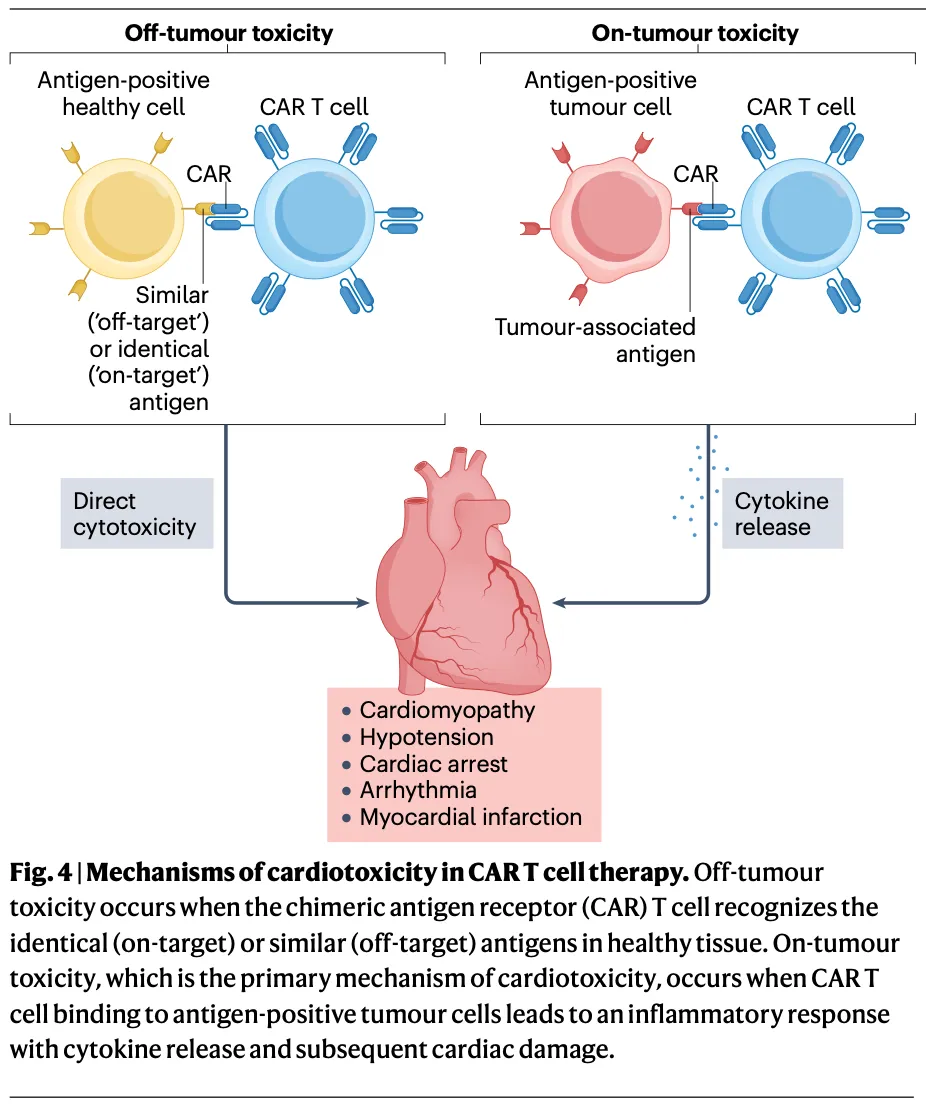 图4 | CAR-T细胞疗法中心脏毒性的机制: 该图清晰地对比了“肿瘤上毒性”和“肿瘤外毒性”。左侧显示“肿瘤上毒性”是心脏毒性的主要机制:CAR-T细胞与抗原阳性的肿瘤细胞结合,引发炎症反应和细胞因子释放,继而导致心脏损伤。右侧显示了“肿瘤外毒性”,即CAR-T细胞识别了健康组织(包括心脏)中相同(靶向)或相似(脱靶)的抗原,直接造成损伤。但目前尚无心脏“靶向肿瘤外毒性”的确诊病例。
